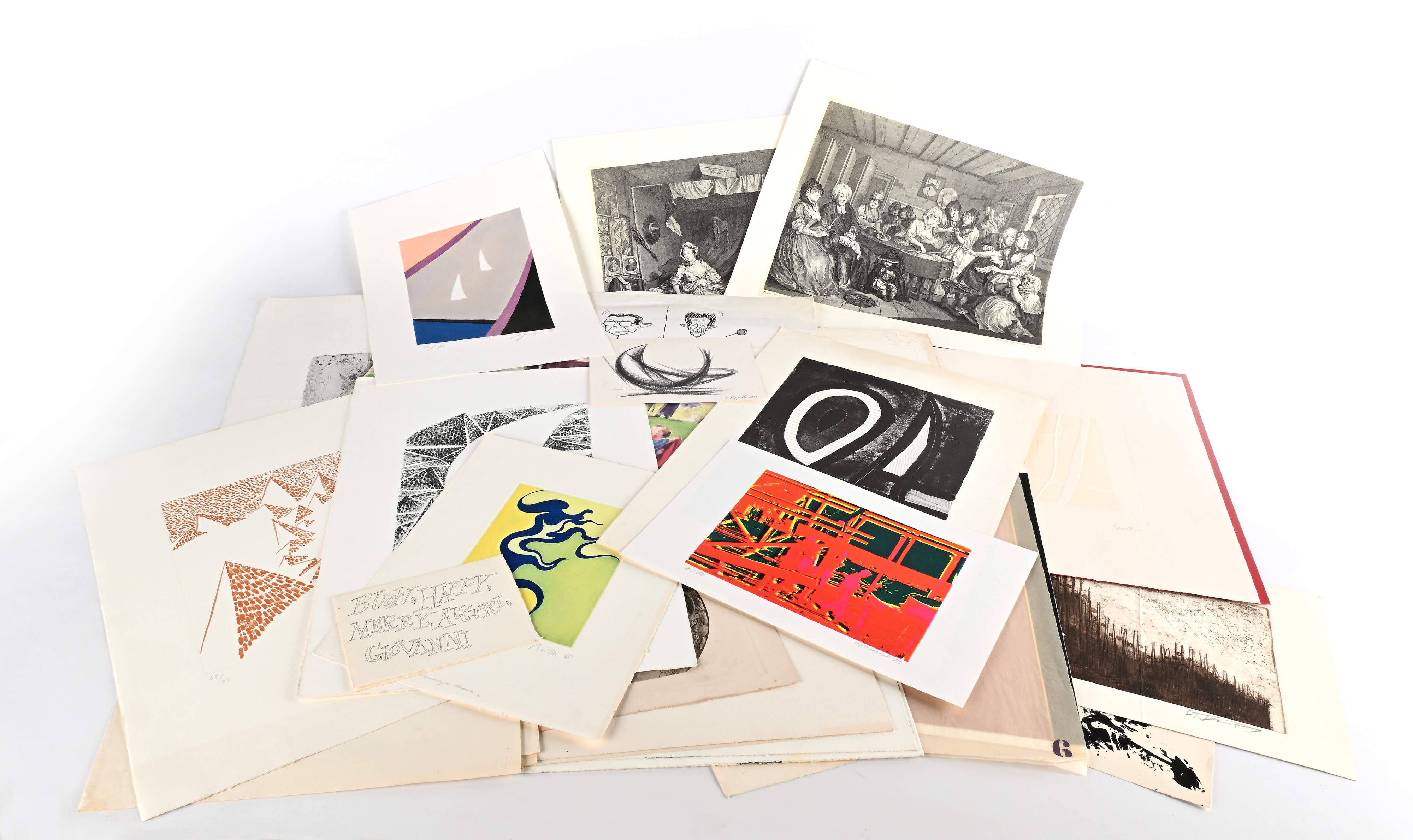 Lotto di 25 opere grafiche di autori vari e Cartella con 6 incisioni Hogarth edite da Electa