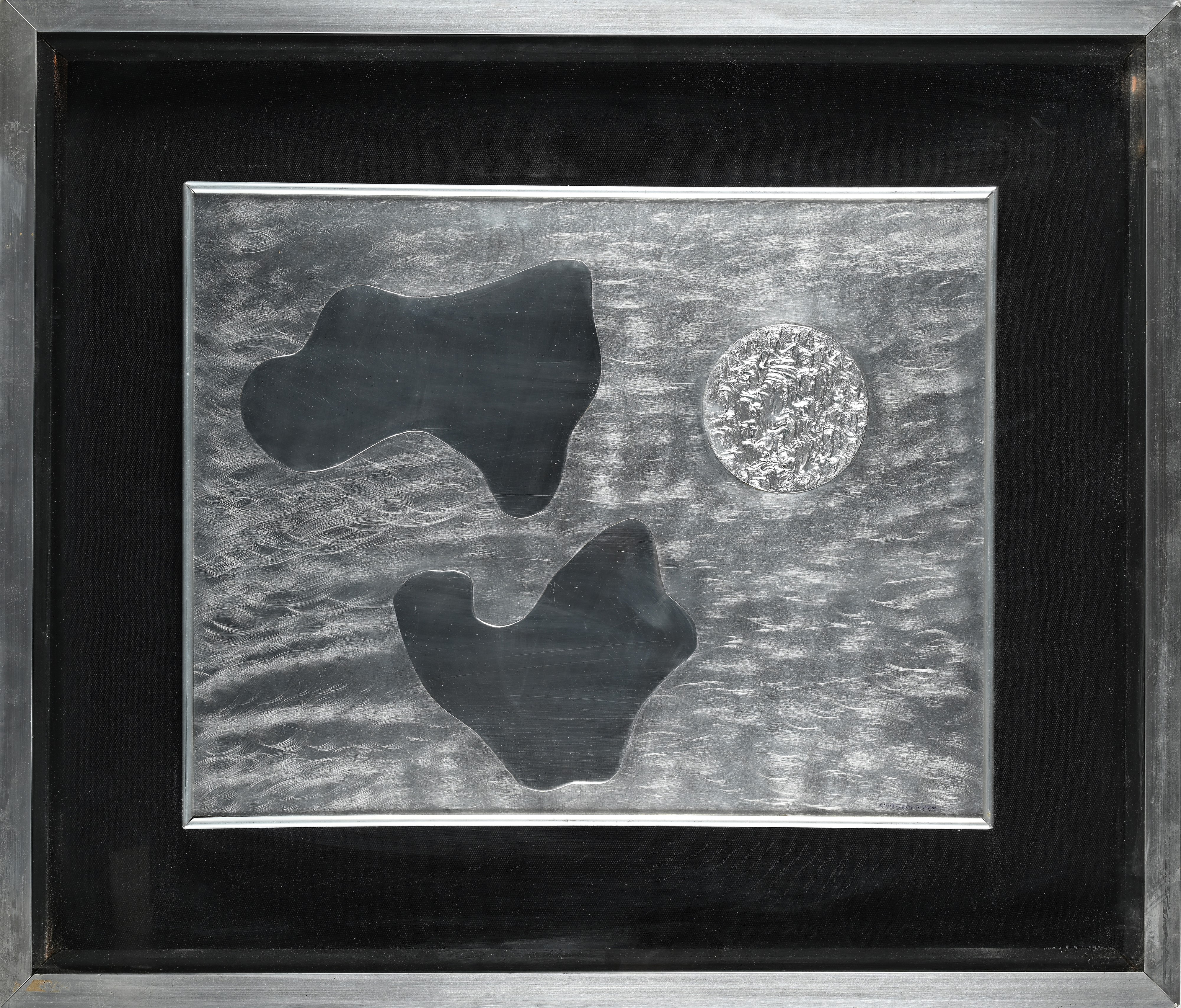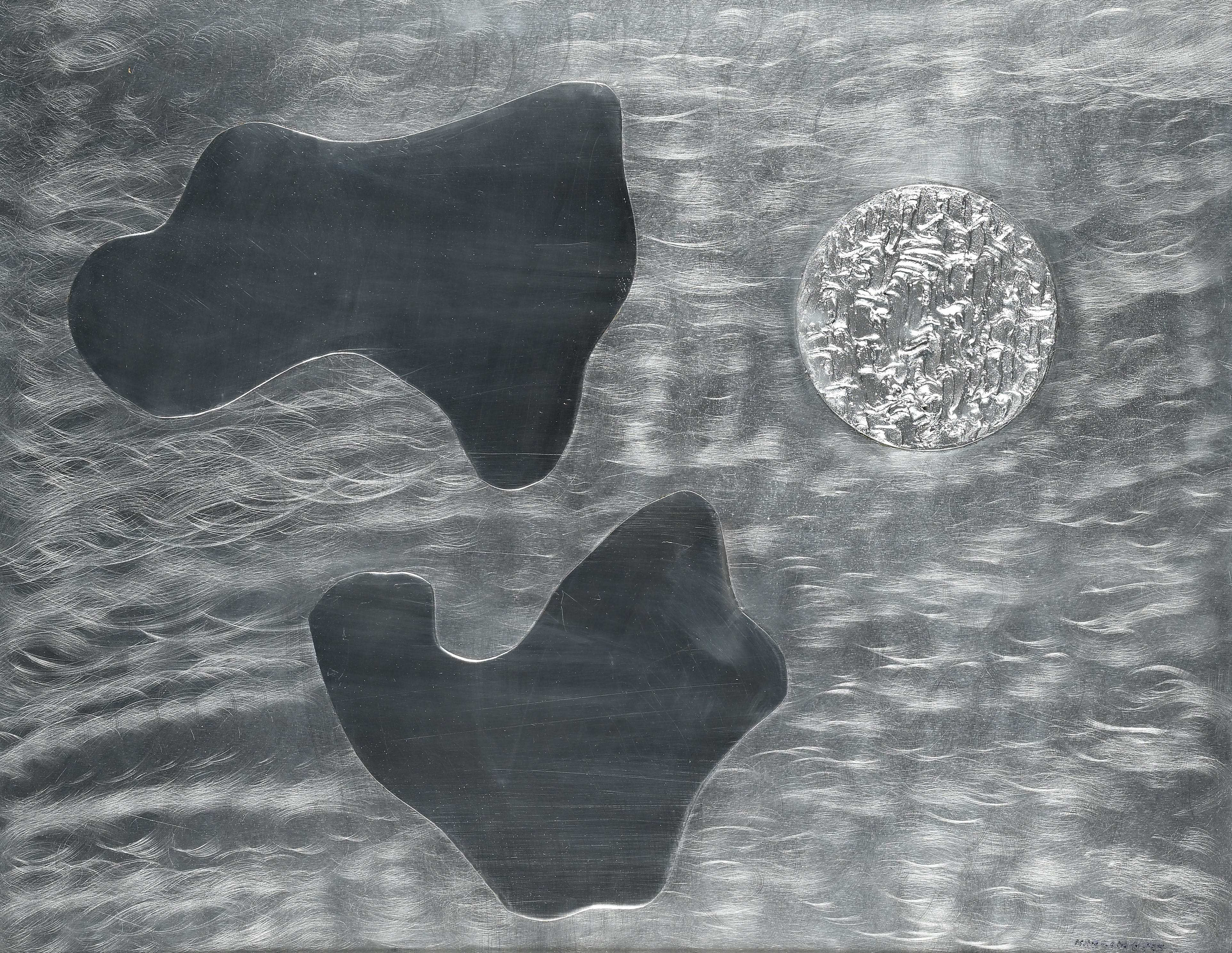 Alluminio molato, pittura a smalto argento e collage di metallo