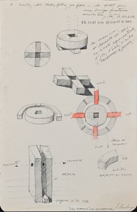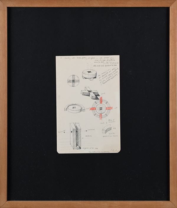 Firma e titolo sul fronte in basso "Dal piano d'uso collettivo, G. Pomodoro". In alto dedica a Dario Micacchi.