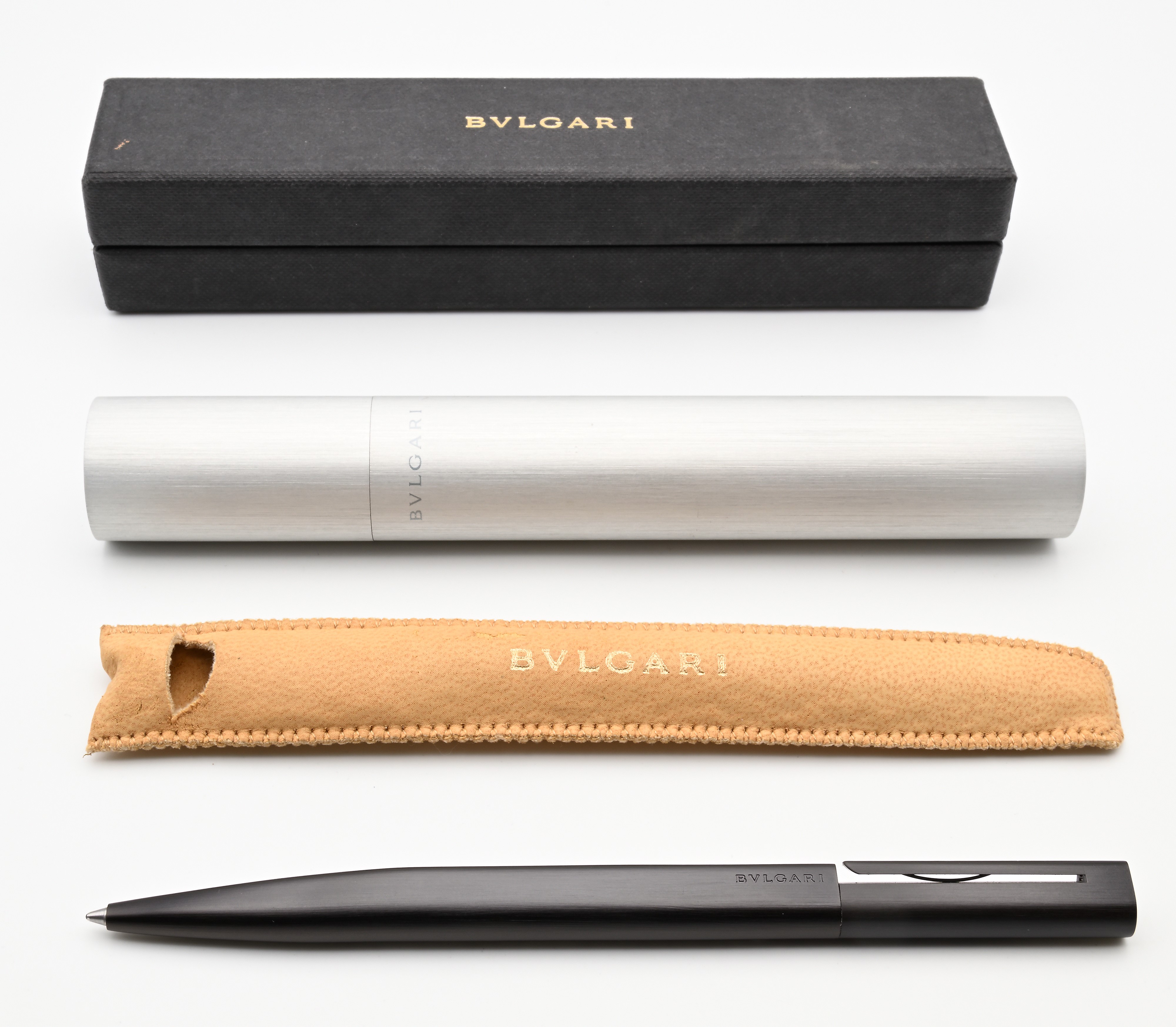 Entro astuccio a tubo in metallo e scatola in cartone, con porta penna in pelle originali