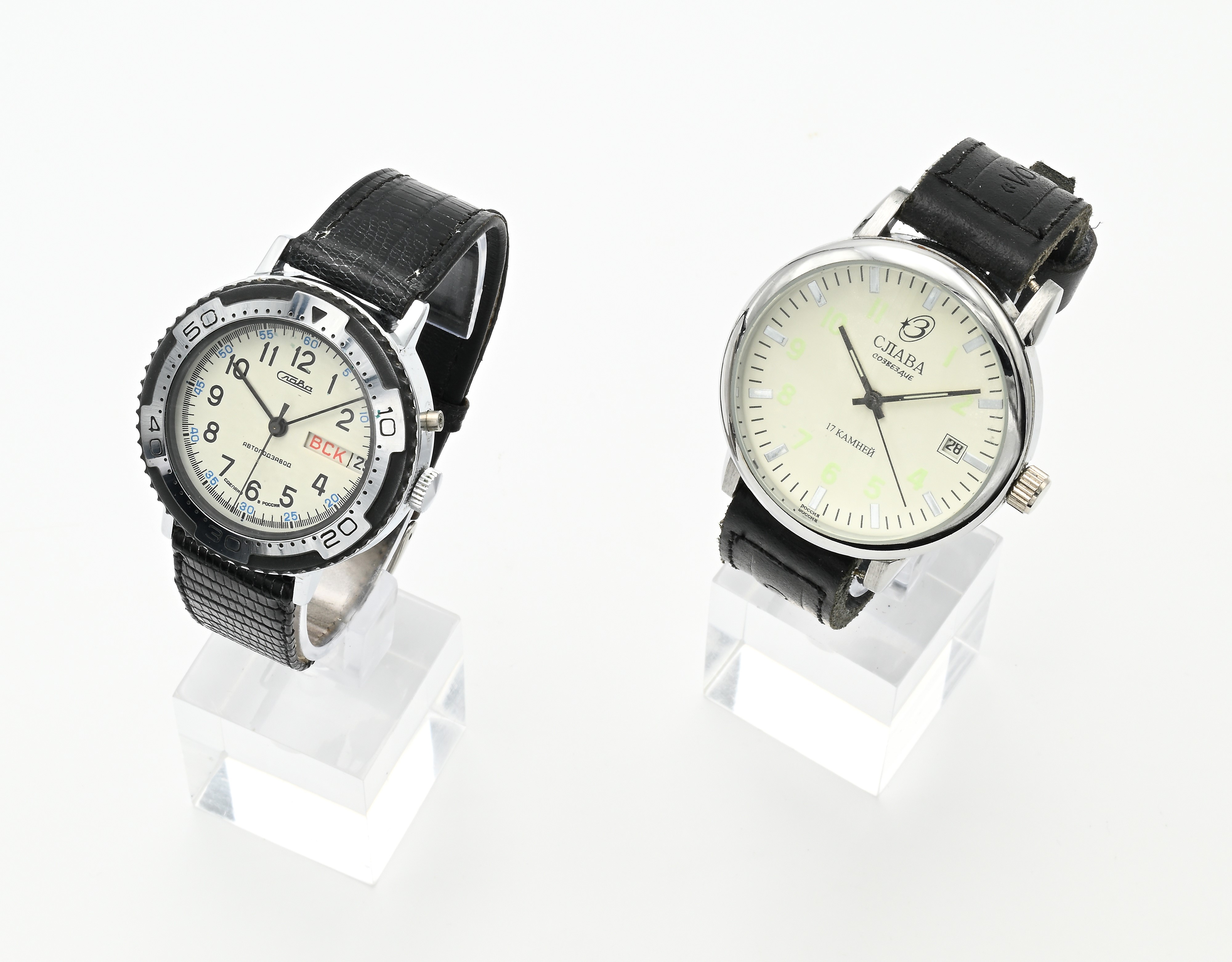 Slava - 2 orologi da polso con datario a carica meccanica da uomo in metallo cromato ed acciaio