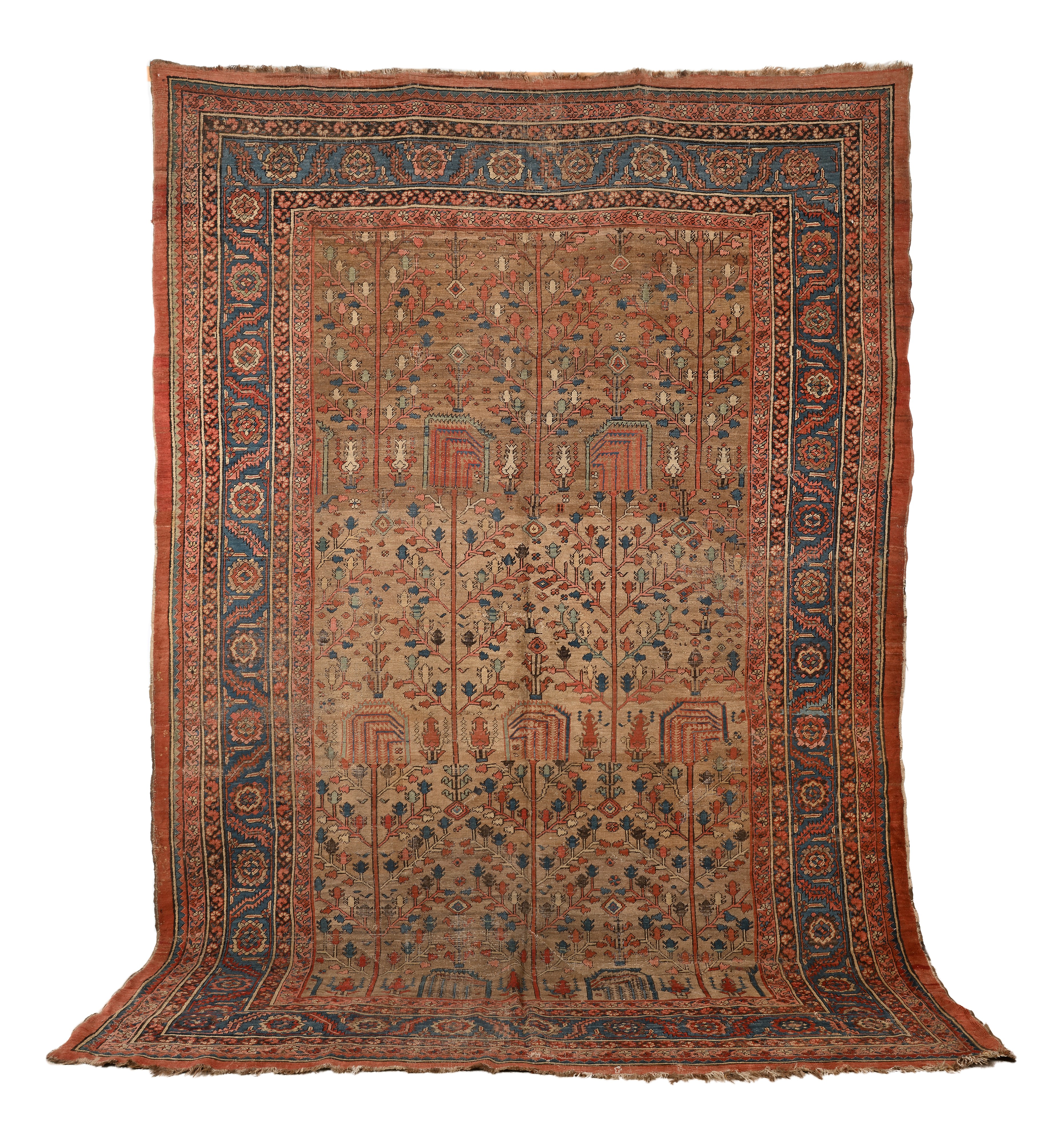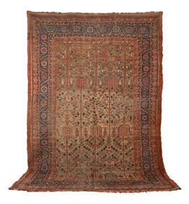 Affascinante tappeto persiano antico proveniente dall’area di Tabriz, caratterizzato dal celebre motivo “a giardino”, uno dei più suggestivi e simbolici della tradizione orientale.