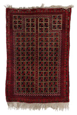 Tappeto caratterizzato da campo suddiviso in una fitta griglia di piccoli motivi geometrici ripetuti, su fondo nei toni del rosso scuro e nero. Nella parte superiore si distingue una nicchia stilizzata (mihrab). Bordura con motivi geometrici continui su fondo rosso, affiancata da cornici secondarie. Disegno minuto e regolare, tipico della produzione Baluch.