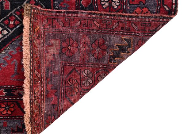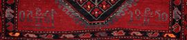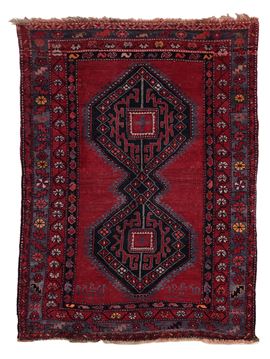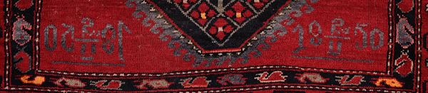 Tappeto caratterizzato da un campo rosso bordeaux decorato con due grandi medaglioni esagonali uniti lungo l’asse centrale, arricchiti da motivi geometrici stilizzati. Bordure multiple con decorazioni floreali e geometriche. Nella parte inferiore è presente una data tessuta. Disegno deciso e di gusto arcaico, tipico delle produzioni caucasiche dell’area Kazak.