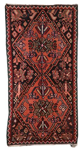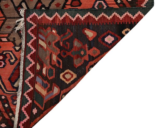 Tappeto caratterizzato da un campo arancio-rosso decorato con due grandi medaglioni esagonali allungati lungo l’asse centrale, arricchiti da motivi geometrici e stilizzazioni zoomorfe. Bordura con motivo a denti e cornici secondarie semplici. Disegno deciso e di forte impatto visivo, tipico delle produzioni caucasiche dell’area Kazak (tipo Karachoph). Presente iscrizione nell’angolo inferiore.