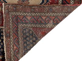 Tappeto da preghiera caratterizzato da una nicchia (mihrab) architettonica su campo rosso, con medaglione centrale ottagonale e motivi floreali stilizzati. La parte superiore è decorata da un fitto riempimento di piccoli elementi ripetuti. Bordure multiple con decorazioni geometriche e angolari. Cromia nei toni del rosso, blu e avorio. Disegno ordinato e raffinato, tipico delle produzioni Shirvan.