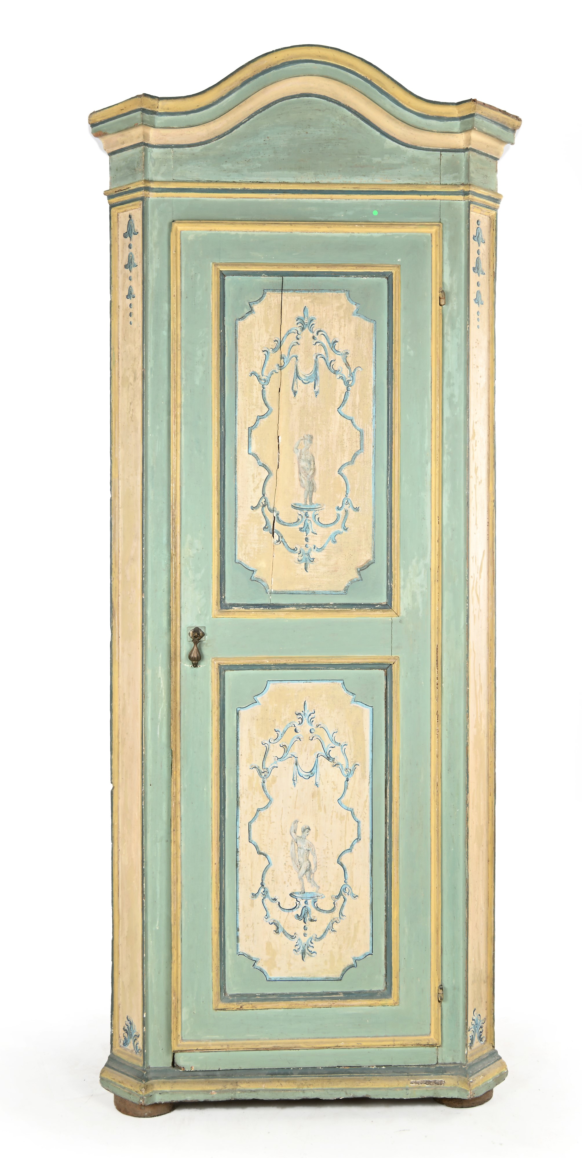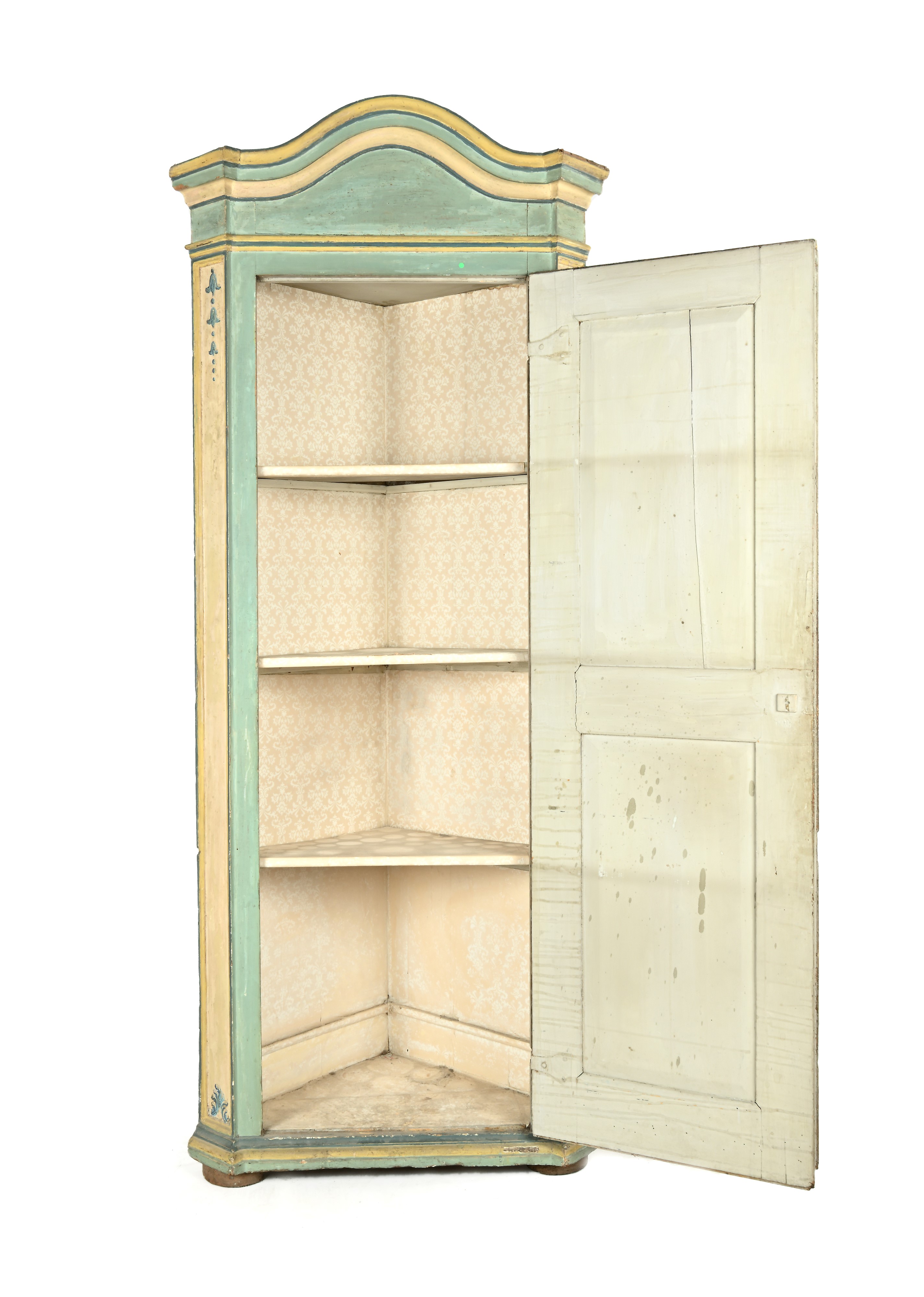 Angoliera in legno laccato azzurro e bianco, XIX secolo, restauri e difetti
