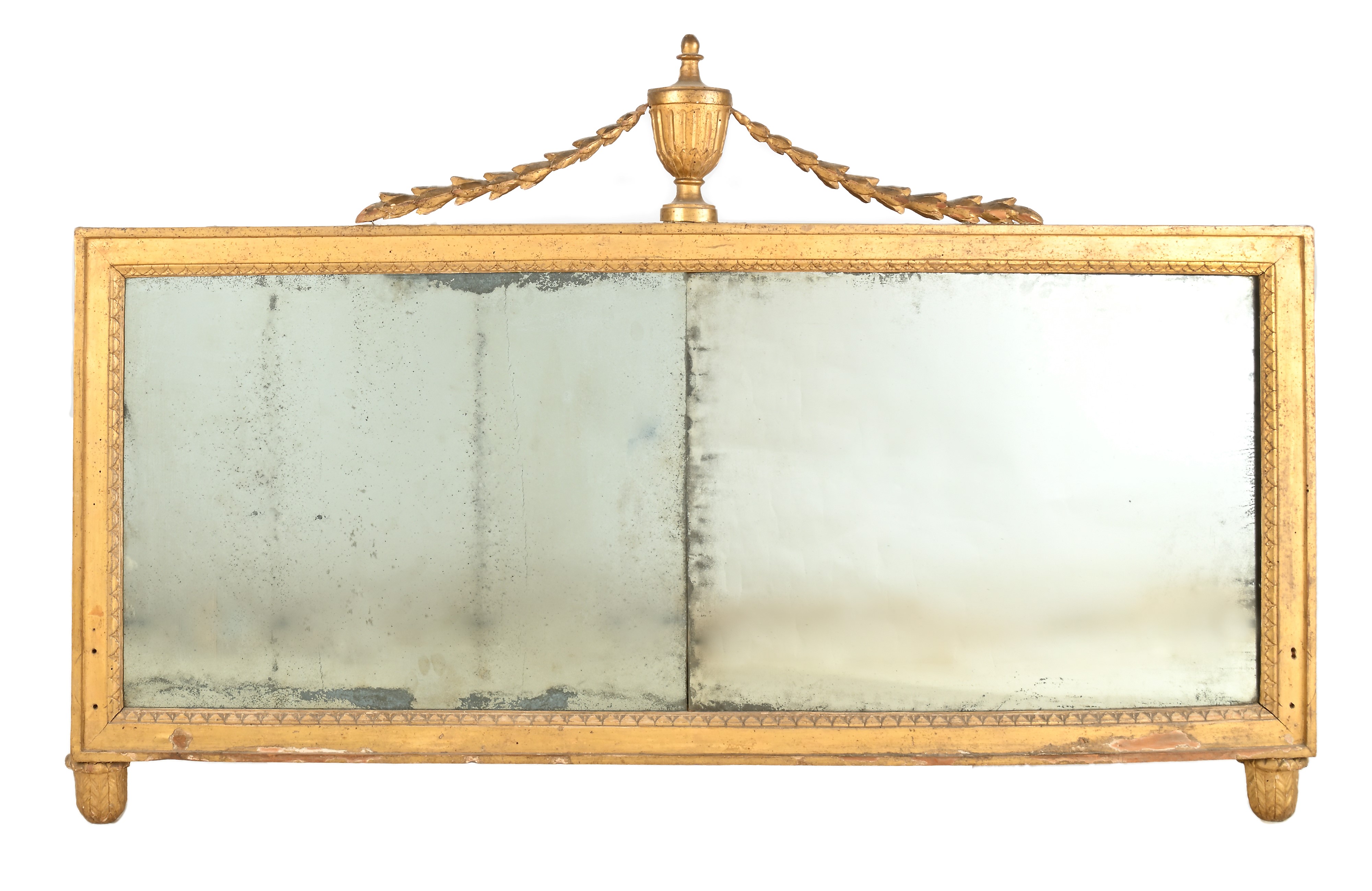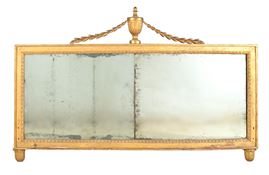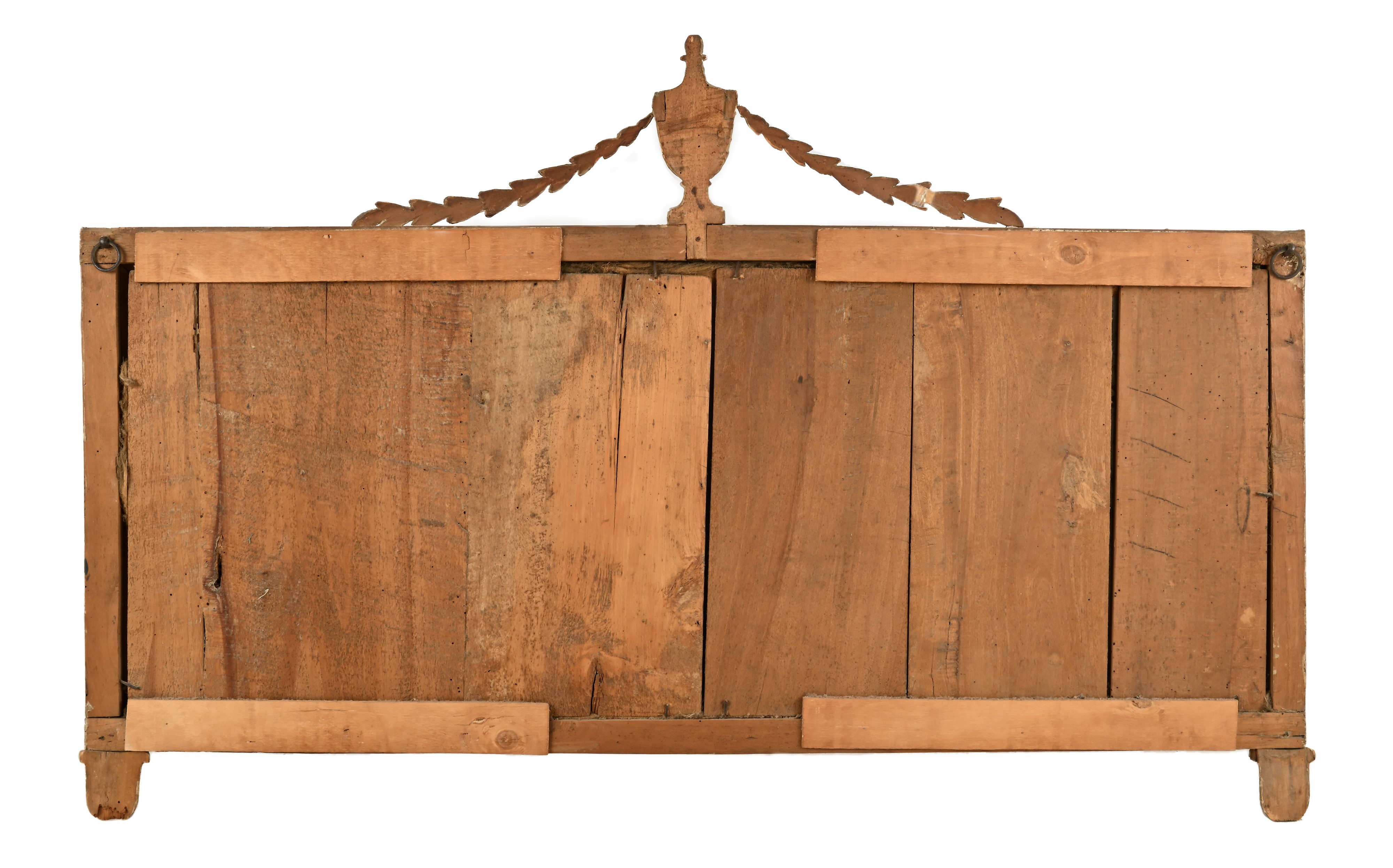 cornice rettangolare a fascia liscia sormontata da un fastigio con vaso centrale da cui si dipartono due brevi festoni intagliati