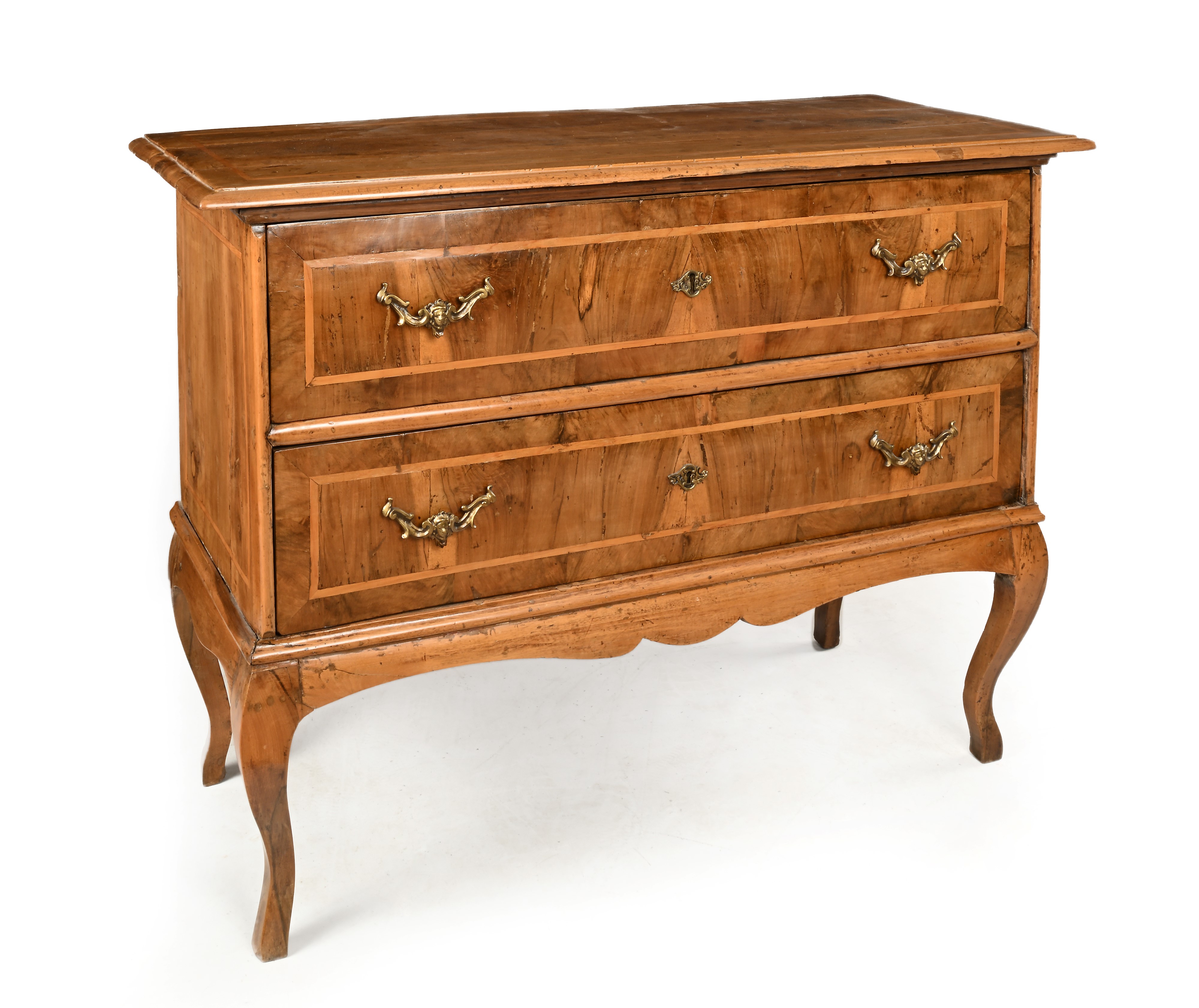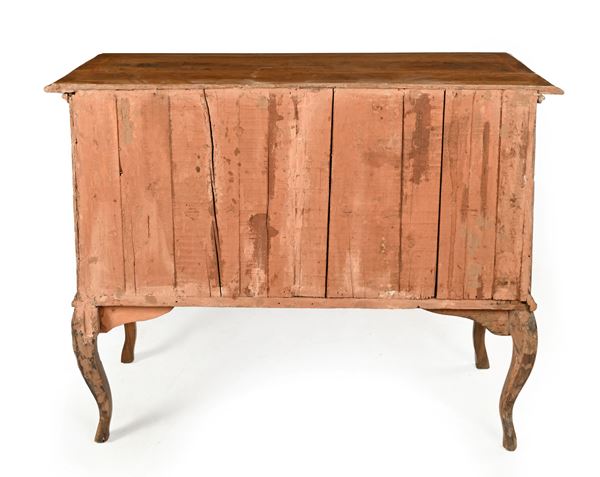 piano sporgente, due cassetti con maniglie in bronzo con mascheroni, gambe mosse