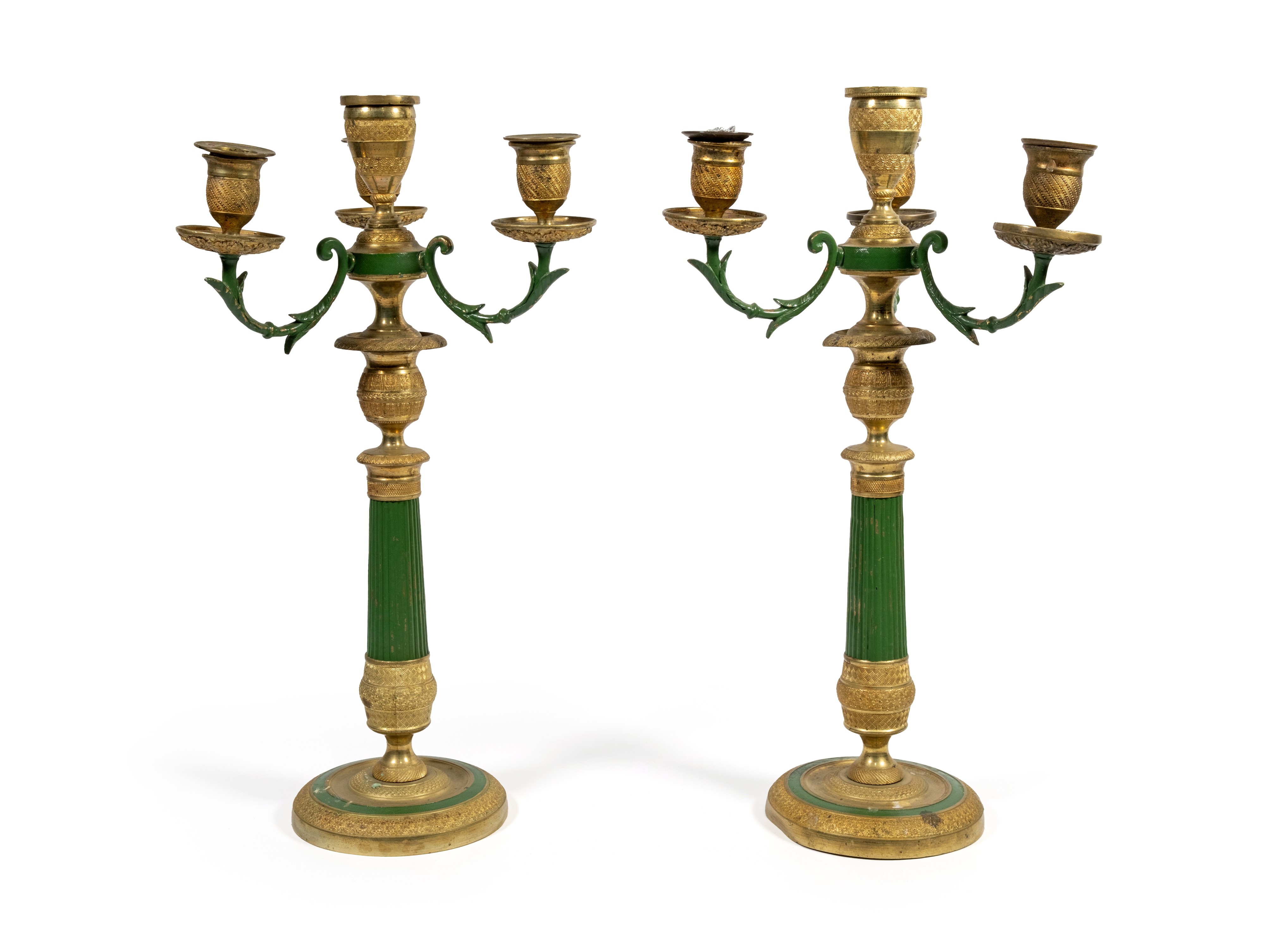 Coppia di candelieri a doppio uso in metallo dorato, seconda metà del XIX secolo