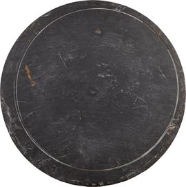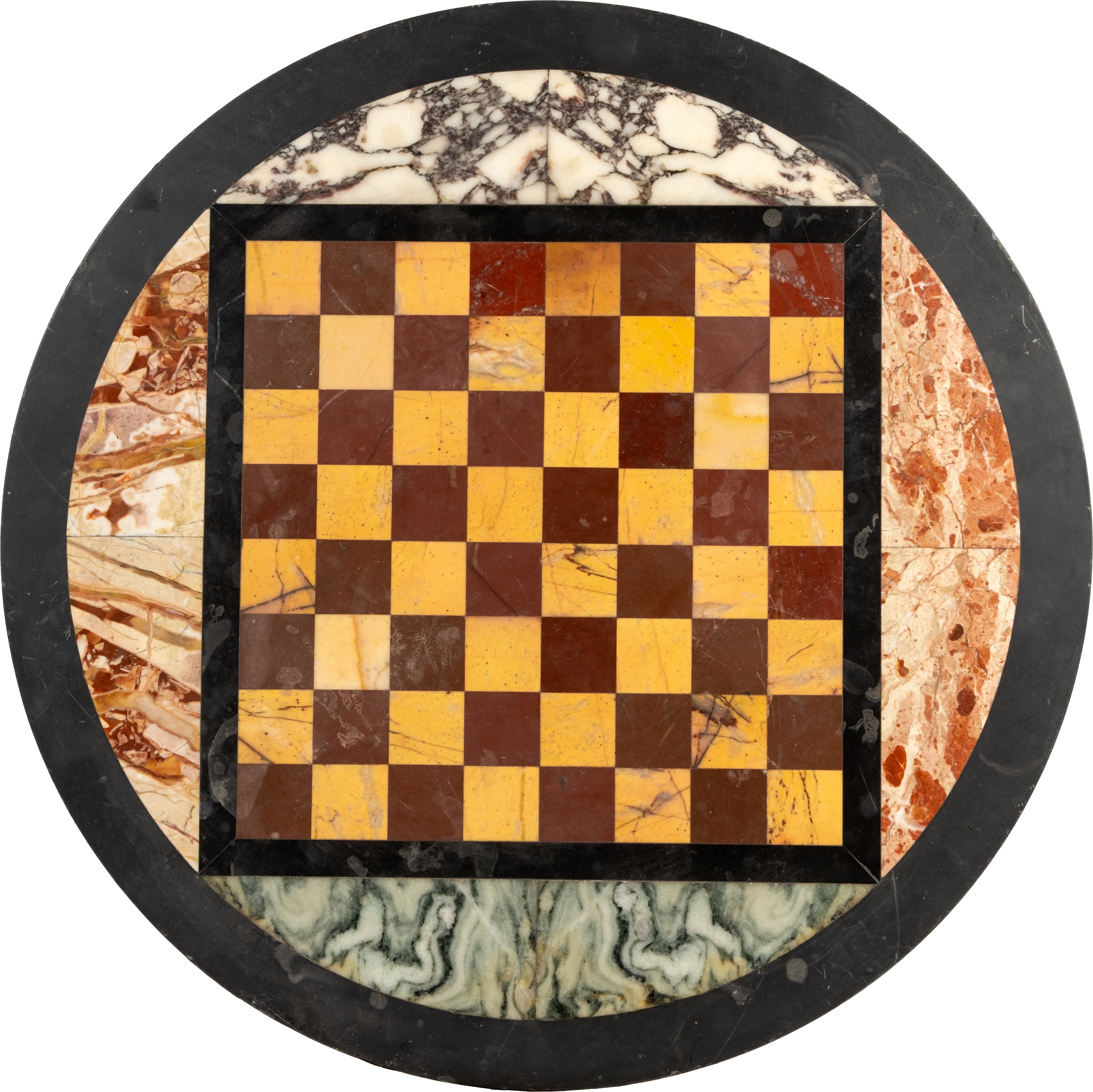Piccolo piano circolare in marmo nero con scacchiera realizzata in marmi rosso e giallo