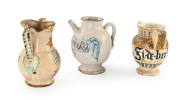 brocca in ceramica decorata in bruno, giallo e blu con uccello; orlo trilobato, manico a nastro, (altezza cm 23); due brocchette diverse con versatoio cilindrico (altezza cm 20 e cm 22). Rotture e mancanze