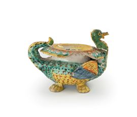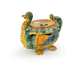 Versatoio zoomorfo porta unguento in maiolica gialla, verde e bruno