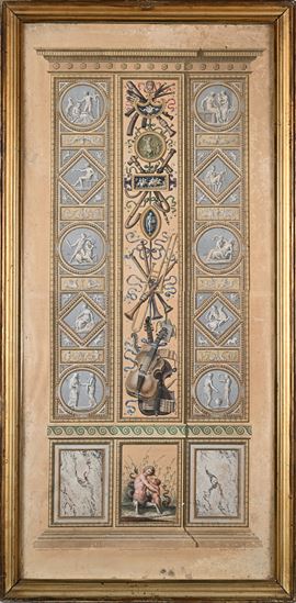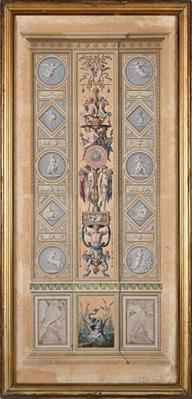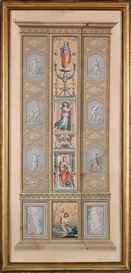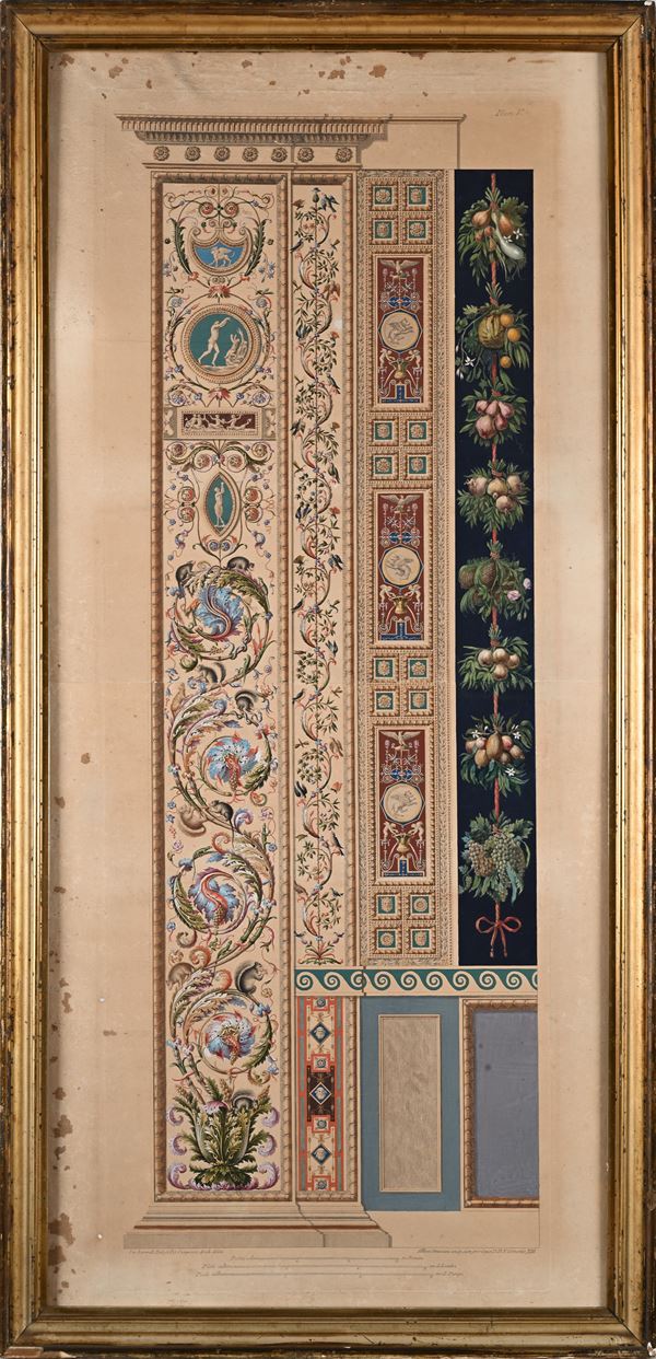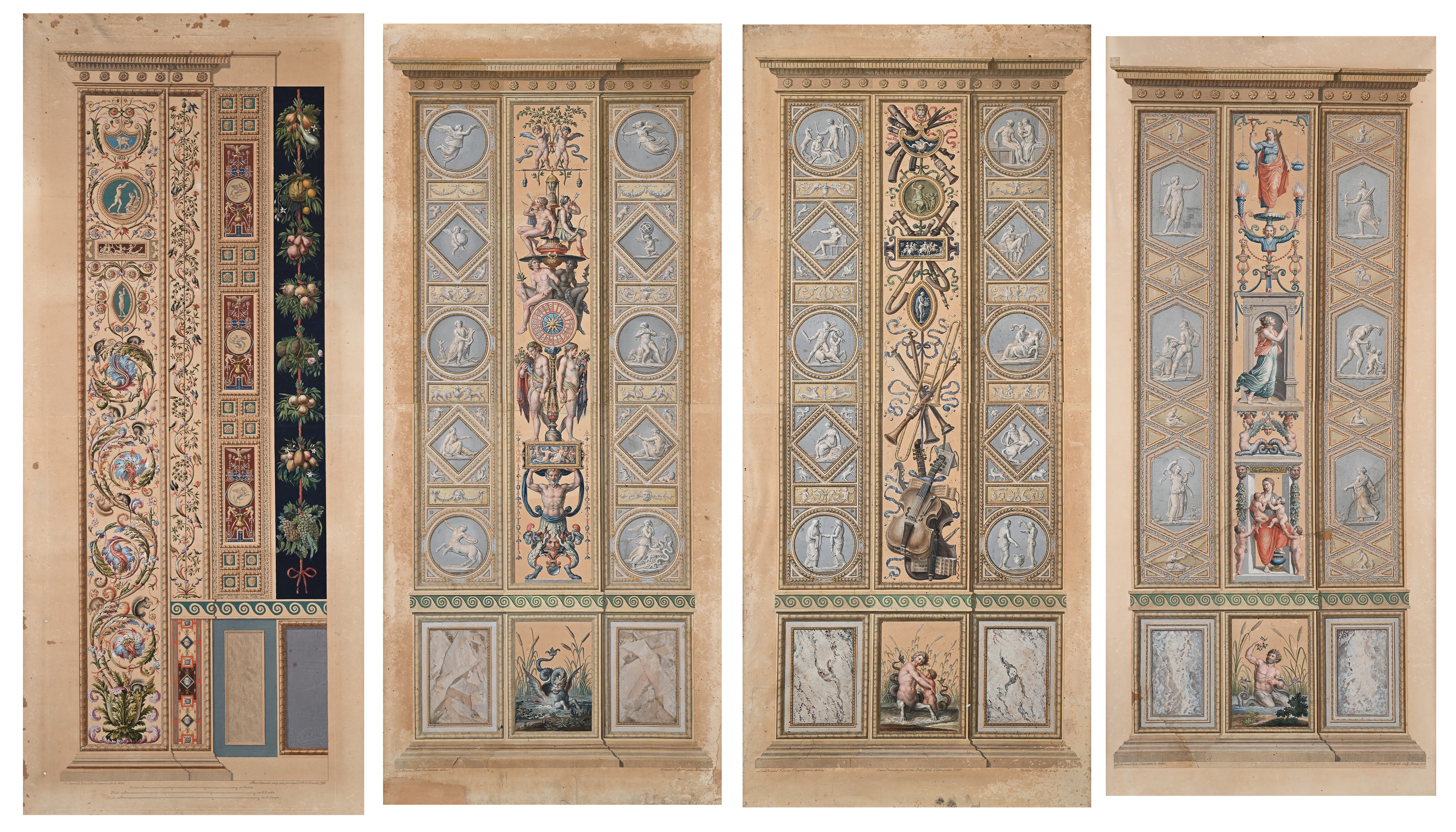 Quattro incisioni colorate raffiguranti pilastri delle Logge di Raffaello in Vaticano