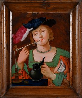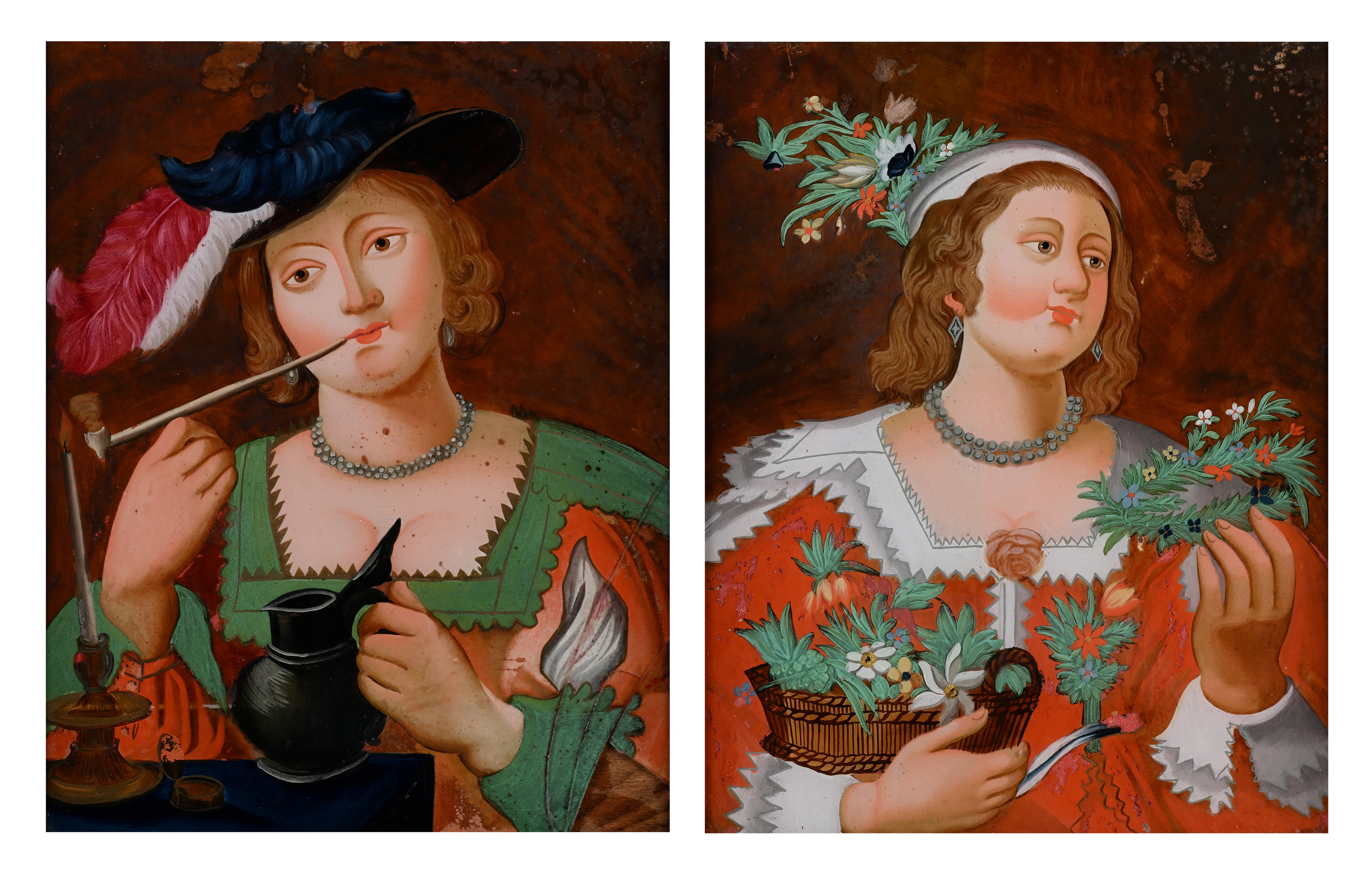 raffiguranti le stagioni "Primavera" con fiori e "Inverno" con la pipa. In cornice