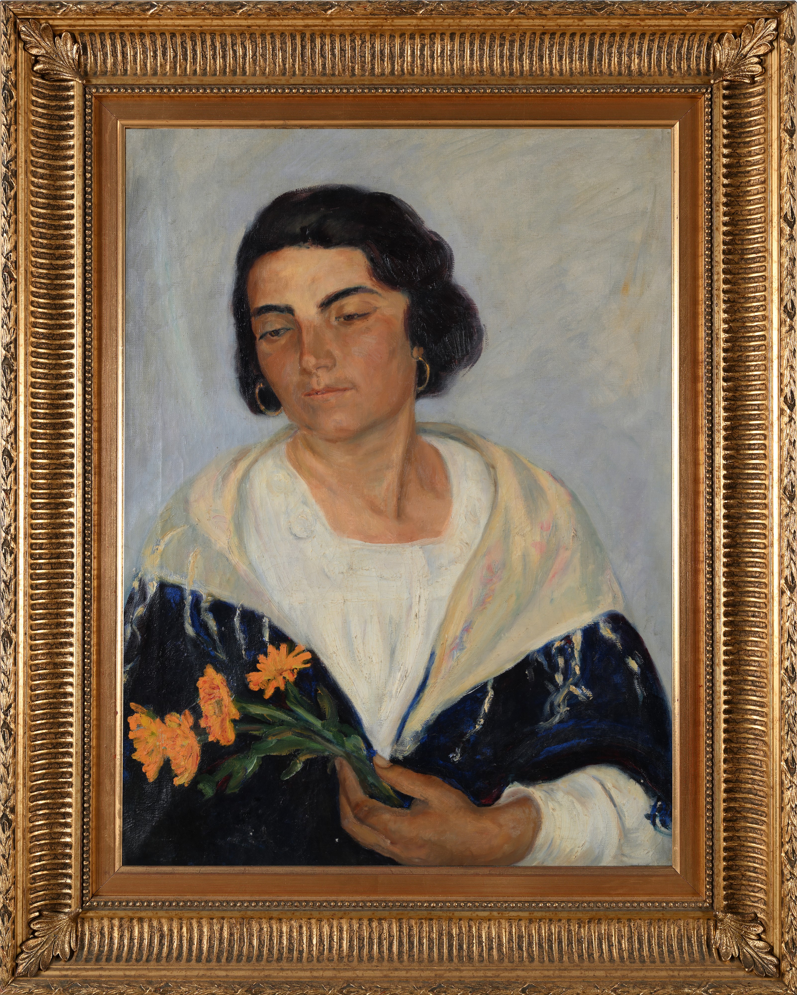 Ritratto di giovane donna femminile con fiori gialli e scialle