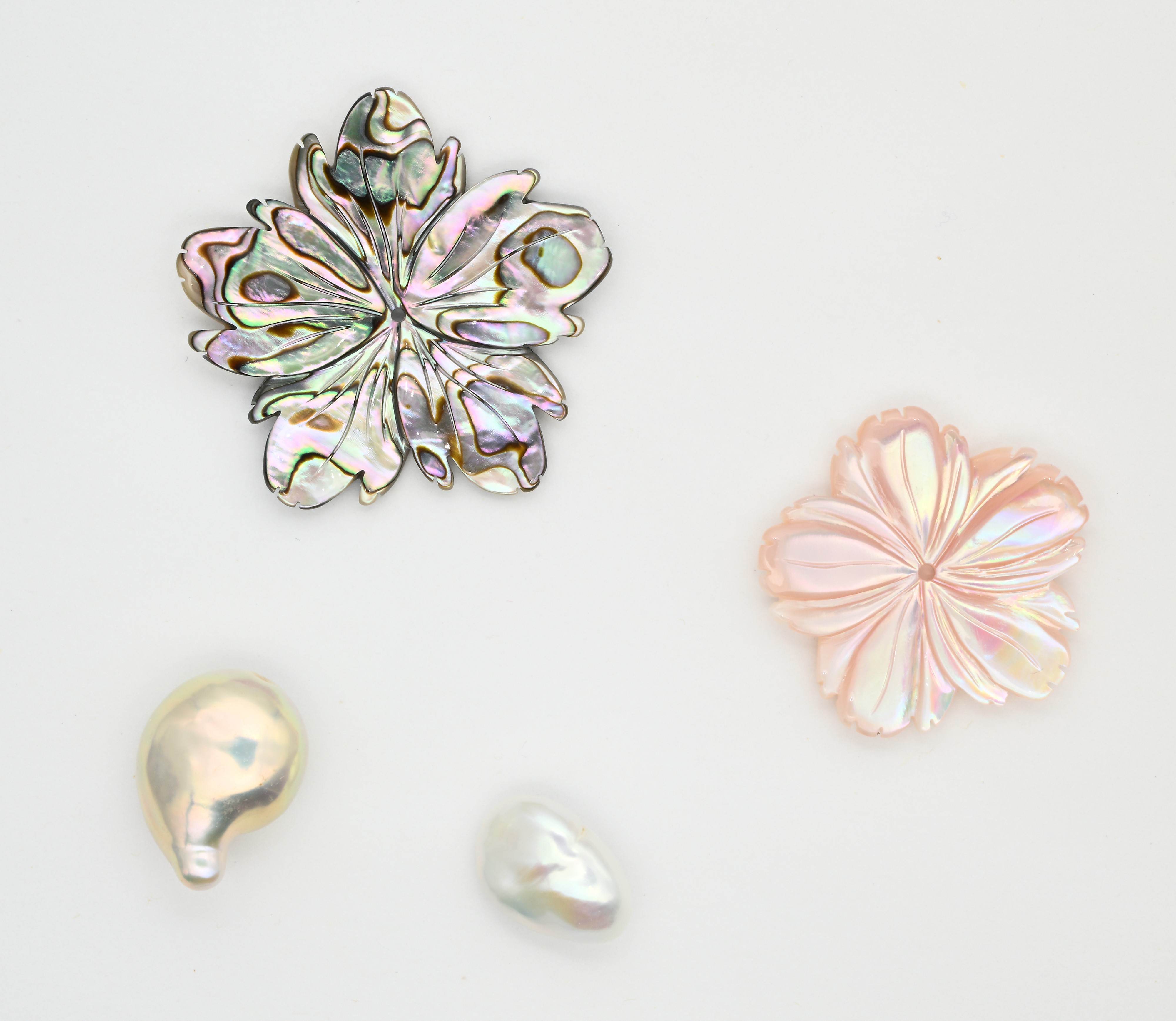 Lotto di 2 perle coltivazione acqua dolce e 2 fiori madreperla