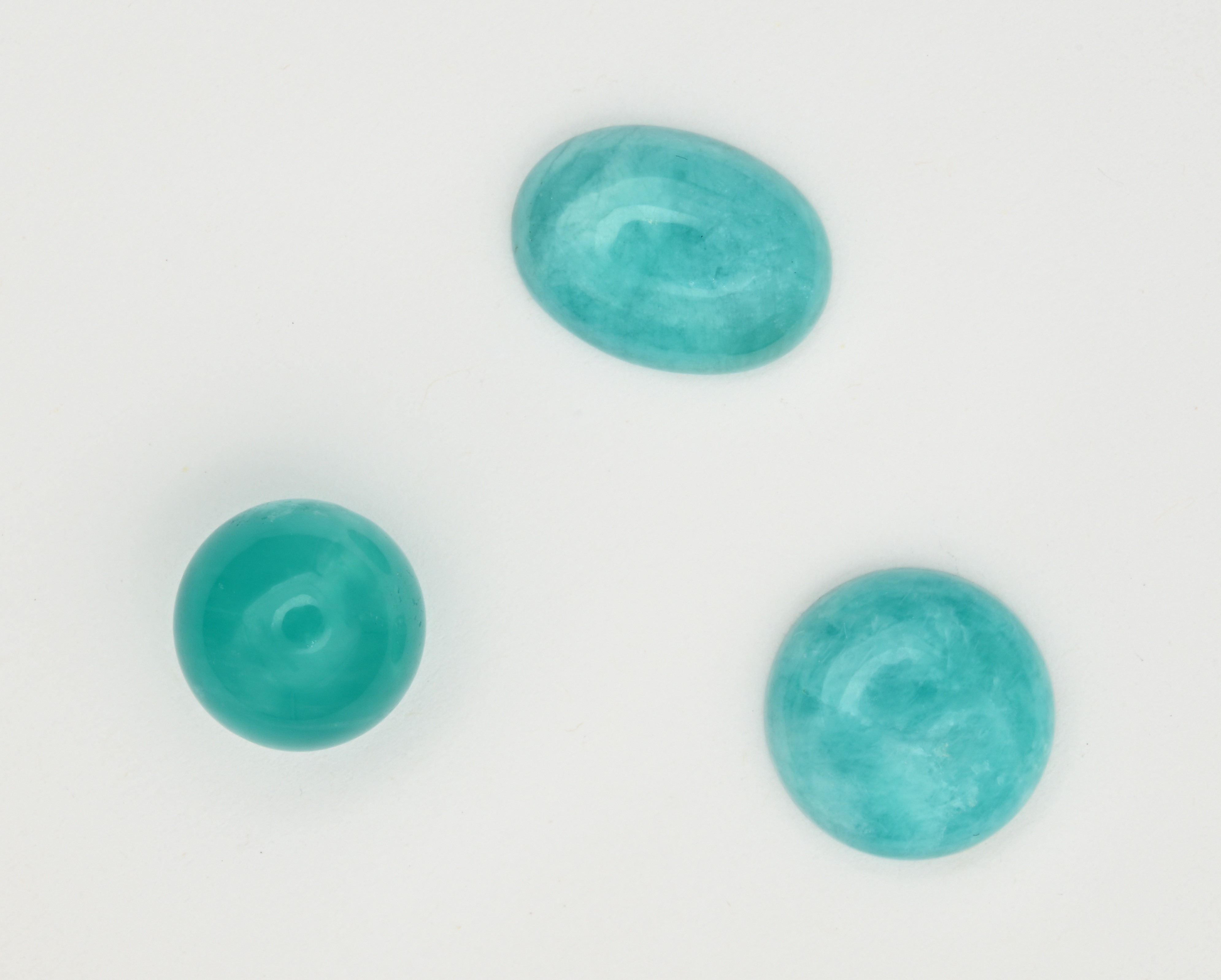 Lotto di tre amazzoniti in taglio cabochon forma tonda e ovale