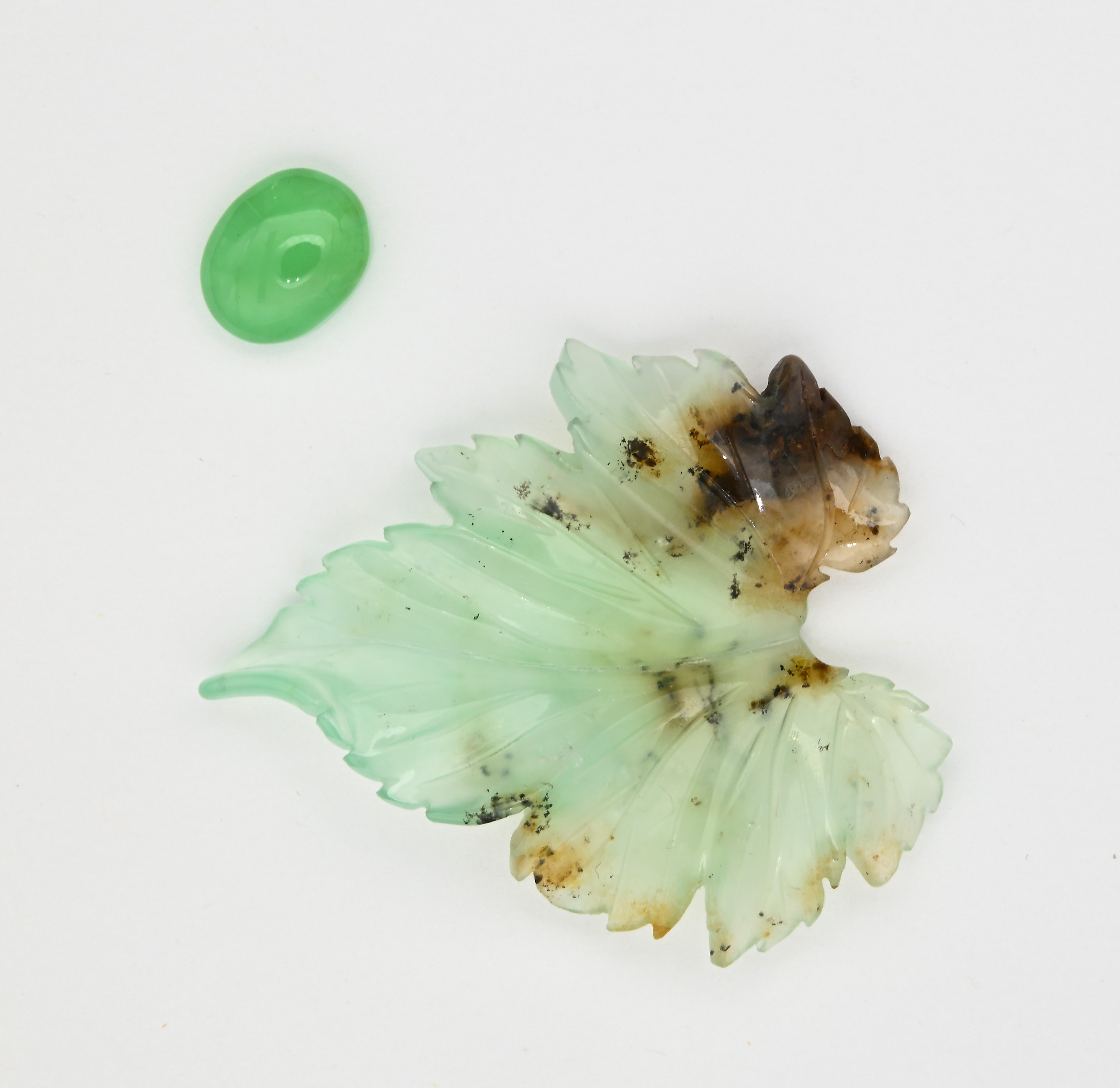 Lotto di un crisoprasio in taglio cabochon ovale e di una foglia in crisoprasio