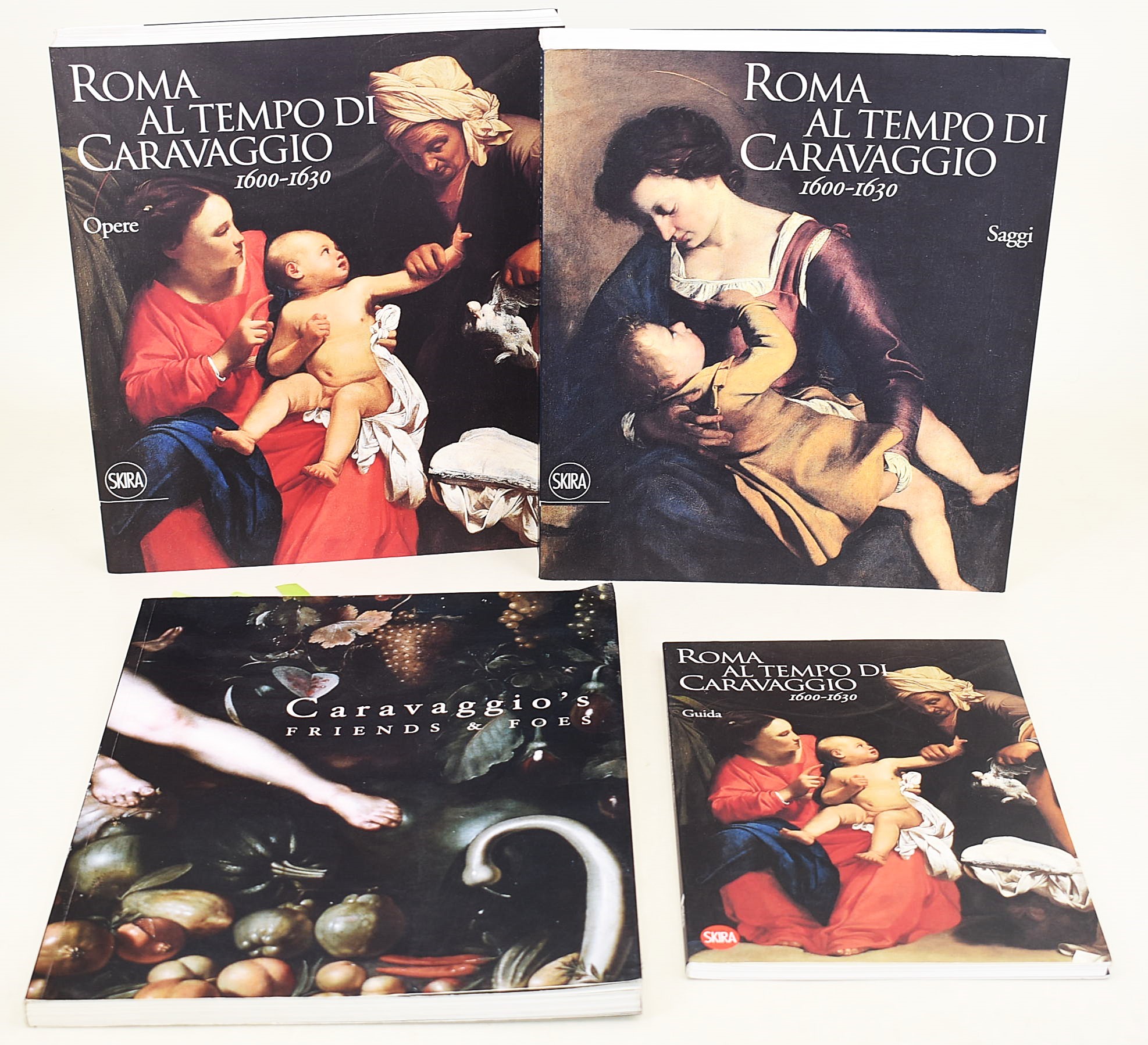 Clark, Edward - Whitfield, Clovis: Caravaggio';s Friends and Foes (Whitfield Fine Art, London 27 May - 23 July 2010), Londra, Whitfield Fine Art, 2010. In-4° (299x235 mm). Pagine 160.Brossura editoriale. Catalogo d’arte riccamente illustrato. Testo in inglese. Catalogo della mostra organizzata da Edward Clark e Clovis Whitfield, dedicata al contesto artistico di Caravaggio e ai rapporti con sostenitori, rivali e seguaci. Il volume analizza opere e protagonisti dell’ambiente caravaggesco romano ed europeo, mettendo in luce dinamiche di influenza, competizione e diffusione del naturalismo. Riccamente illustrato, costituisce un contributo significativo agli studi sul milieu caravaggesco internazionale. Roma al tempo di Caravaggio 1600-1630 Guida-Opere-Saggi, Ginevra-Milano, Skira, 2011. In-4° (Opere-Saggi: 281x242 mm) / In-8° (240x167 mm). 3 volumi. Pagine: 63 / 407 / 447. Catalogo della mostra Roma, Museo Nazionale di Palazzo Venezia Saloni Monumentali 16 novembre 2011-5 febbraio 2012. Brossura editoriale. Edizione illustrata. Catalogo della mostra dedicata al contesto artistico romano nei primi decenni del Seicento, con particolare attenzione alla figura di Caravaggio e alla sua influenza. L’opera, articolata in più volumi, raccoglie saggi, schede e apparati critici, offrendo una ricostruzione approfondita del panorama artistico, culturale e storico dell’epoca. Riccamente illustrata, rappresenta un importante strumento di studio sul primo Barocco romano.