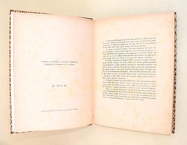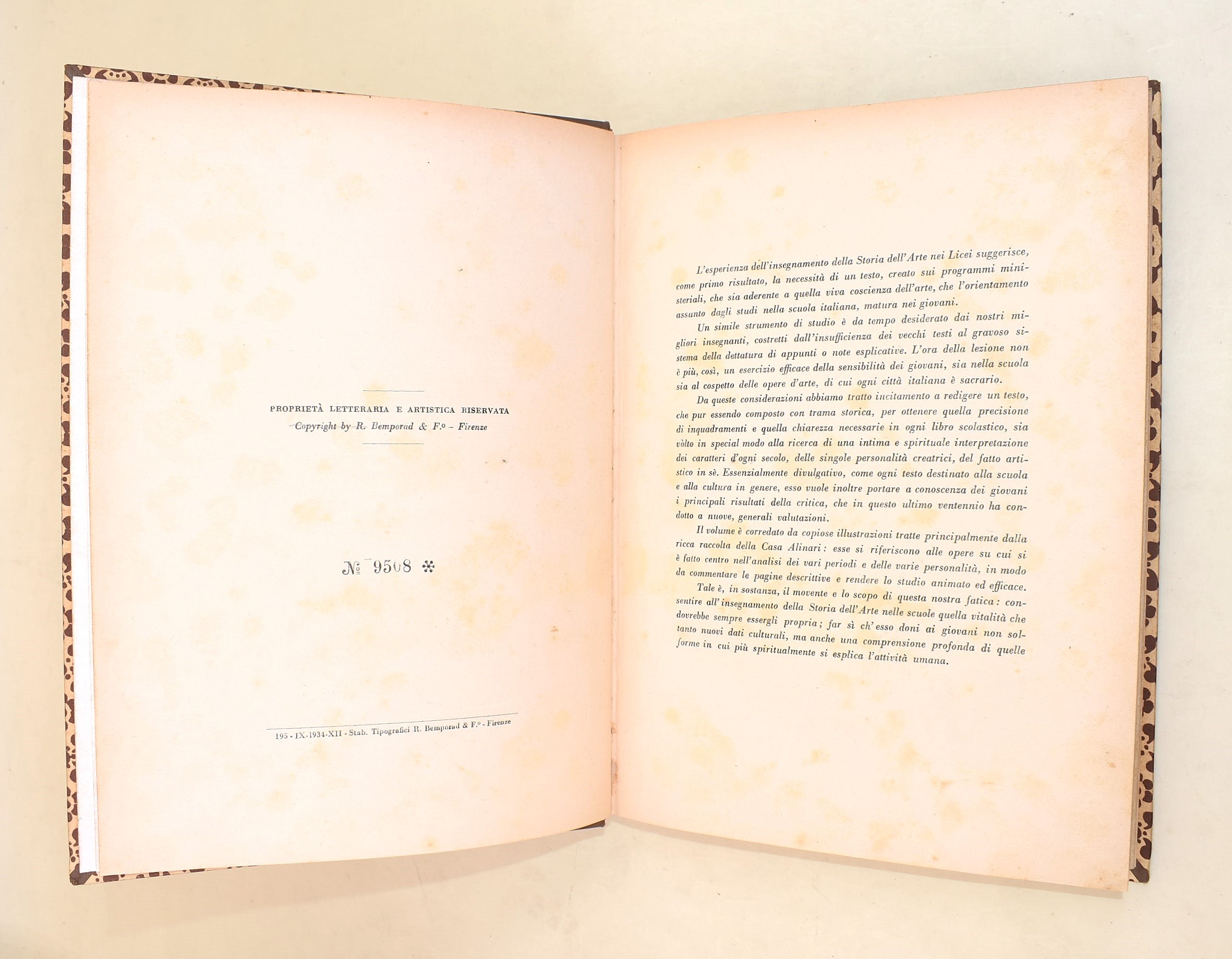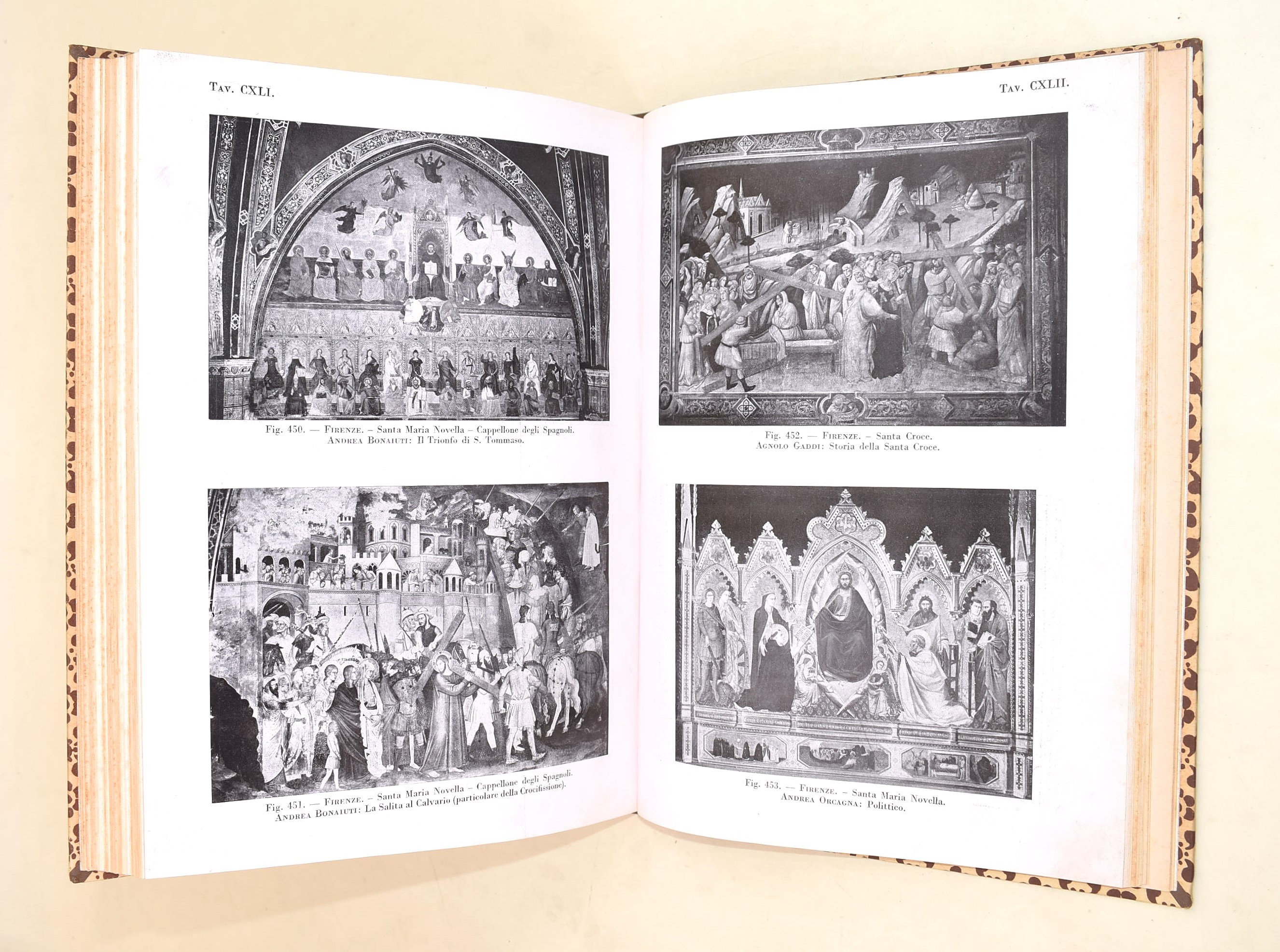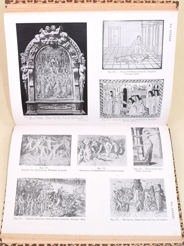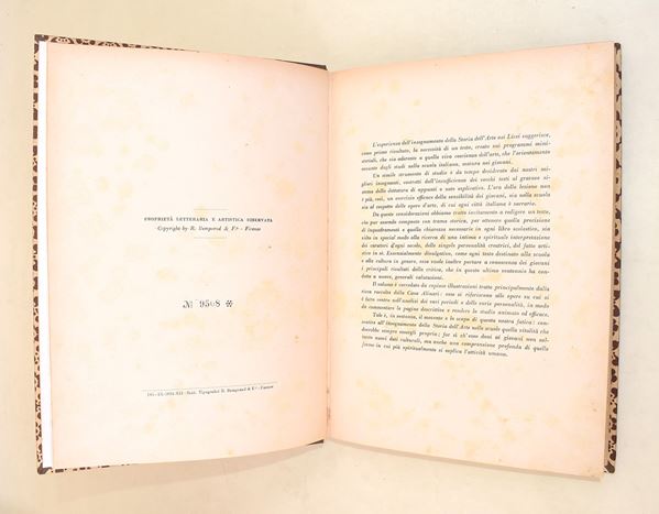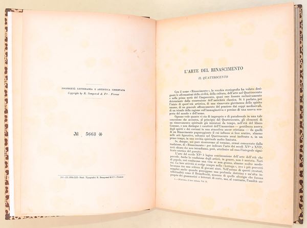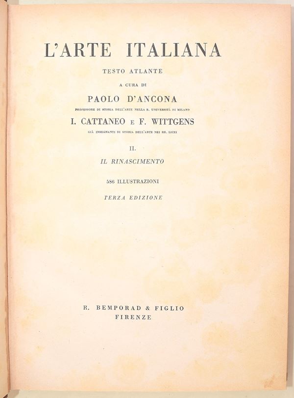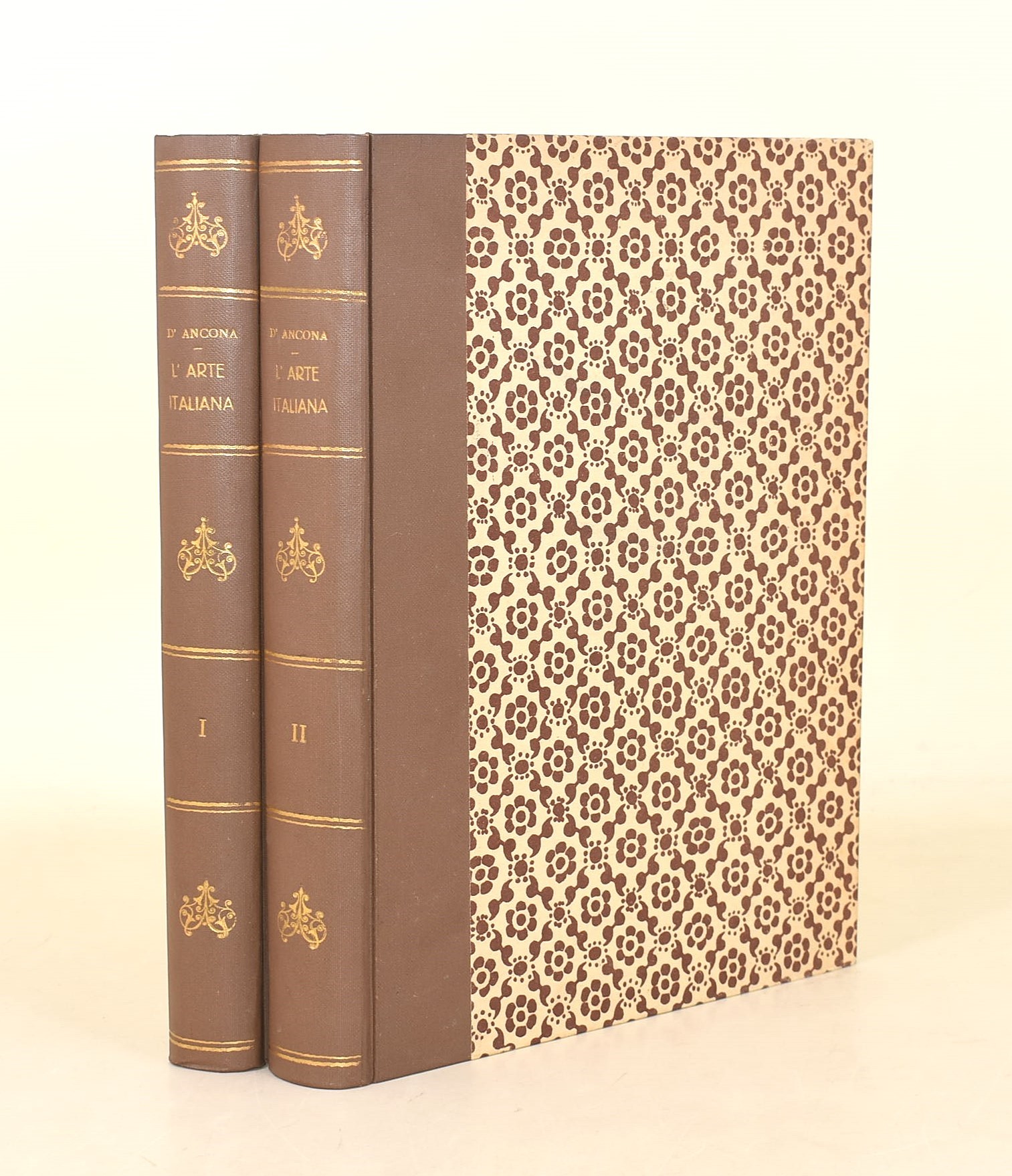 Firenze, R. Bemporad & Figlio, 1934. In-4° (290x208 mm). 2 volumi: I. Dalle origini alla fine del Trecento; II. Il Rinascimento. Pagine: 195 + CLV pagine di tavole in bianco e nero / 253 + CLXXVII pagine di tavole in bianco e nero. Rilegatura in mezza tela. Dorso con titolo, curatore e fregi in oro. Tiratura limitata: vol. I n. 9508; vol. II 5663. Lievi segni del tempo. Opera di sintesi dedicata allo sviluppo dell’arte italiana dalle origini al Rinascimento, curata da Paolo D'Ancona. I due volumi presentano un’ampia panoramica della produzione artistica italiana, dalla tarda antichità e dal Medioevo fino alla piena stagione rinascimentale, con attenzione ai principali centri artistici e ai maestri più rappresentativi. L’opera è corredata da un vasto apparato di tavole illustrative che accompagnano il testo critico, costituendo un utile strumento di consultazione e di studio per la storia dell’arte italiana.