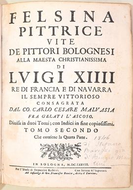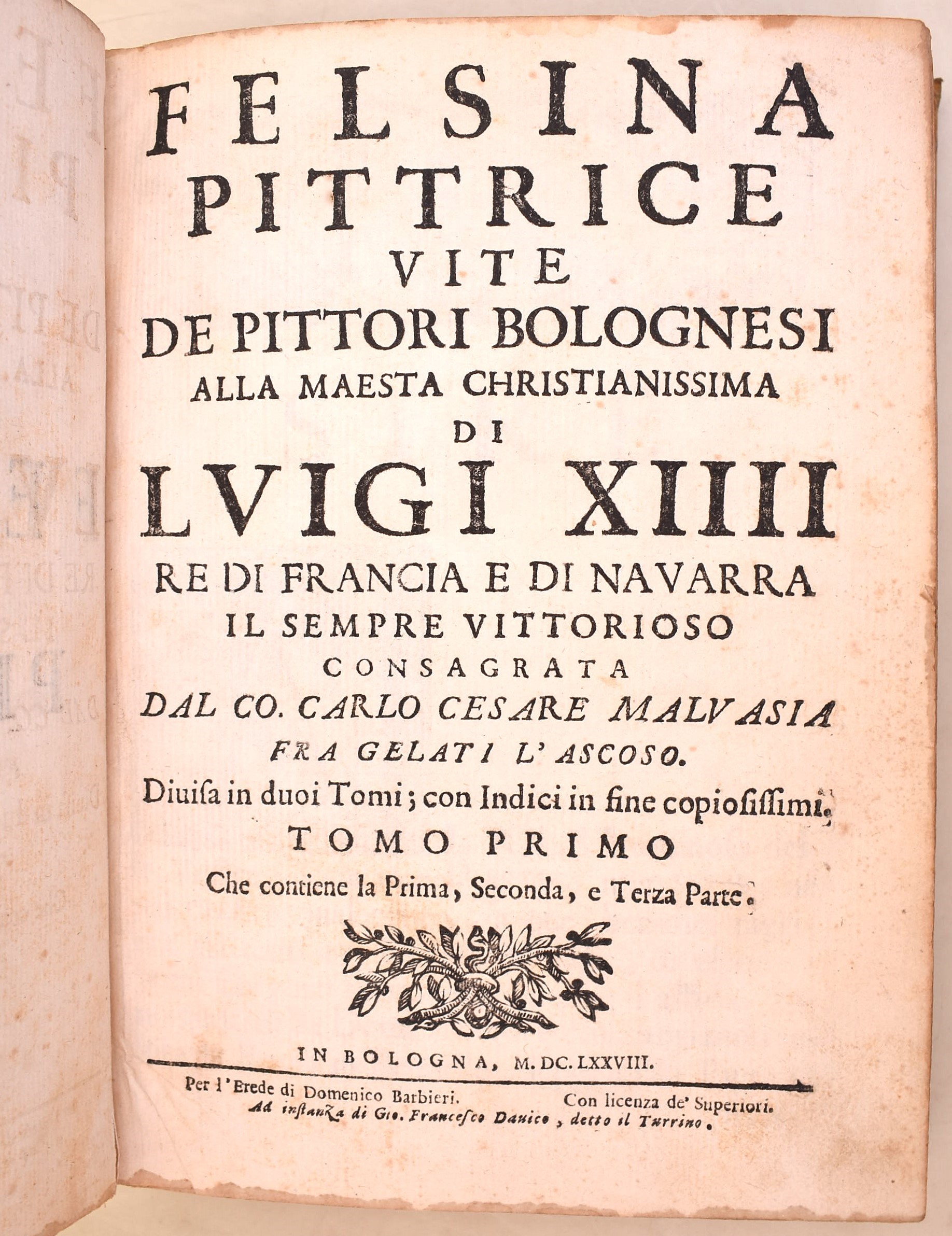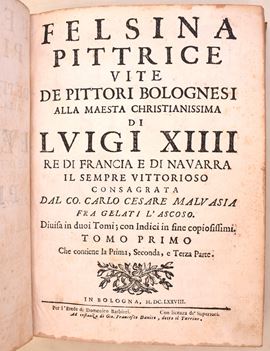 Malvasia, Carlo Cesare: Felsina pittrice vite de pittori bolognesi alla maesta christianissima di Luigi XIIII. re di Francia e di Navarra il sempre vittorioso consagrata dal co. Carlo Cesare Malvasia fra Gelati l'Ascoso. Divisa in duoi tomi; con indici in fine copiosissimi, 1678