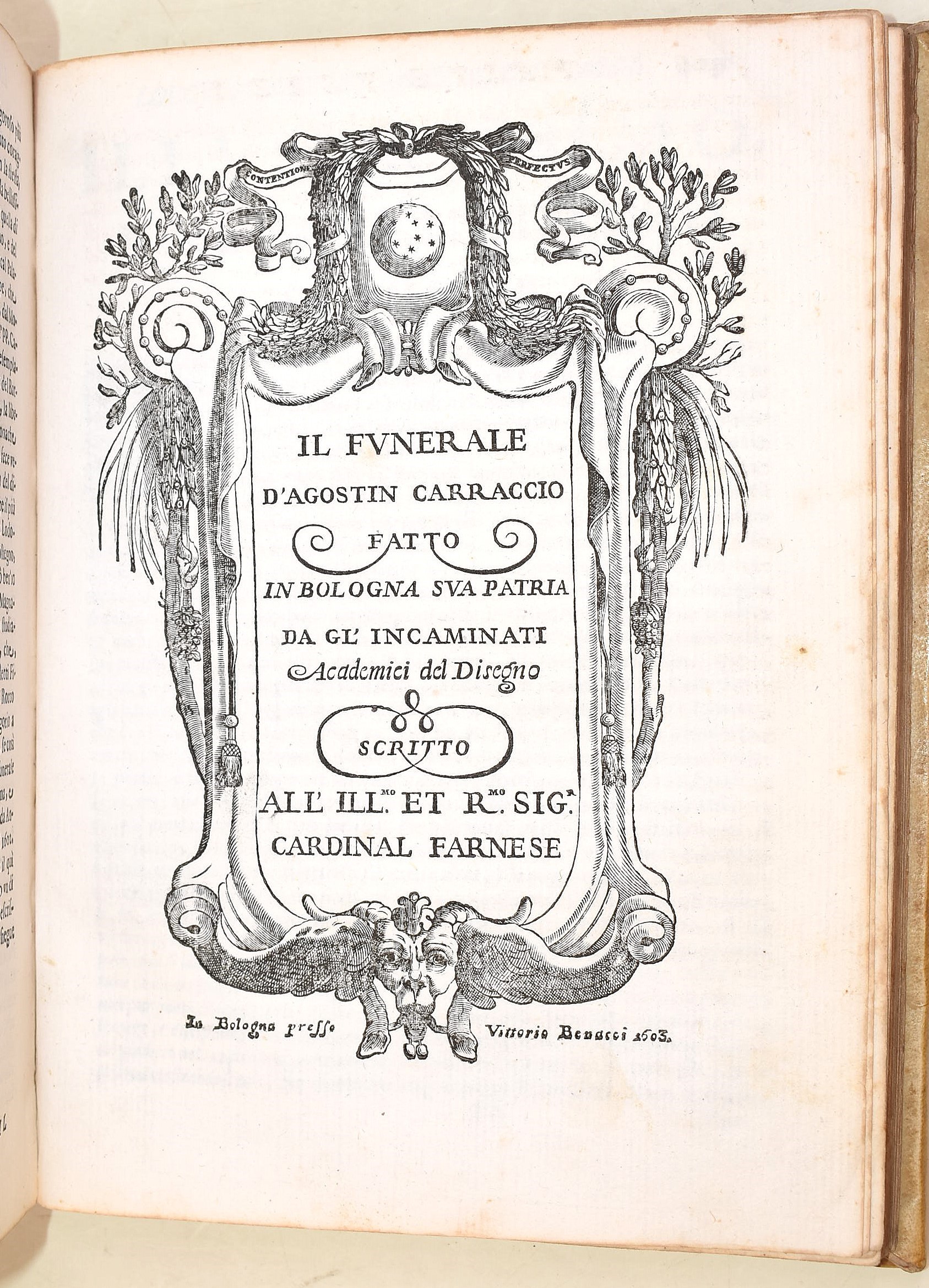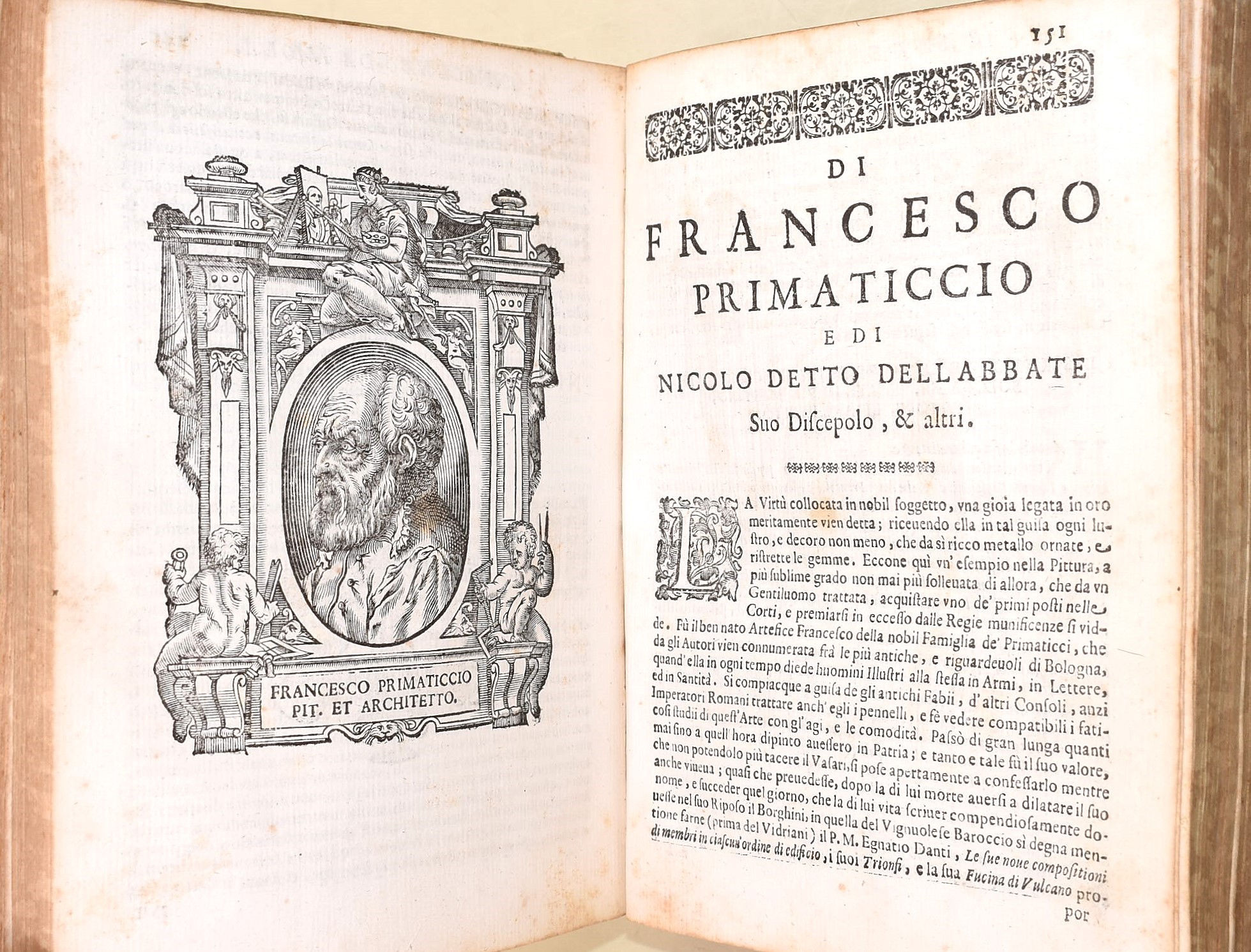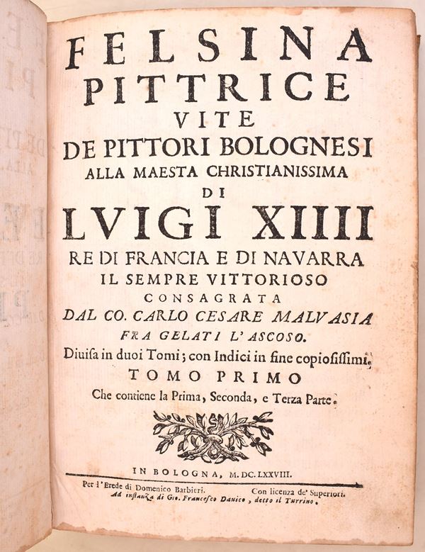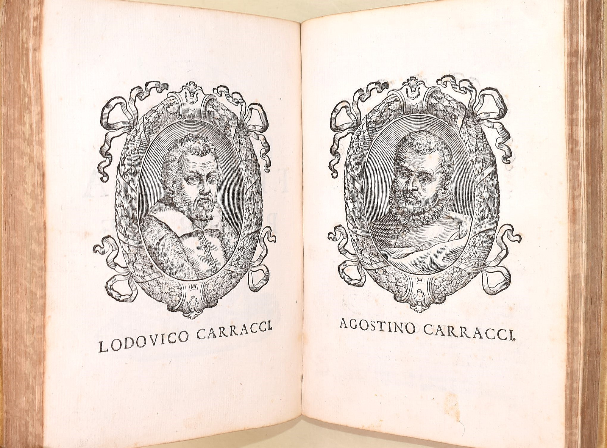 Bologna, per l'erede di Domenico Barbieri: ad instanza di Gio. Francesco Davico detto il Turrino, 1678. Opera in 2 volumi. In-4° (221x164mm). Pagine: (18), 581, (2) / (4), 606, (2). Legatura in piena pergamena. Dorso liscio con un tassello recante autore e titolo in oro. Fregio xilografico sul frontespizio. Iniziali e fregi xilografici. Opera adorna da 50 ritratti, a raffigurare gli artisti descritti nel testo. Quasi tutti i ritratti sono in cornice ovale, otto delle quali non contengono la raffigurazione del relativo artista. Numerose altre incisioni, anche a piena pagina, a raffigurare elementi allegorici, particolari di dipinti, stemmi, monumenti, oltre a svariati cartigli ornamentali, a varie tavole a illustrare il "funerale di Agostin Carraccio" e all'albero genealogico dei Carracci, con ai piedi vedutina di Bologna. Esemplare in barbe.