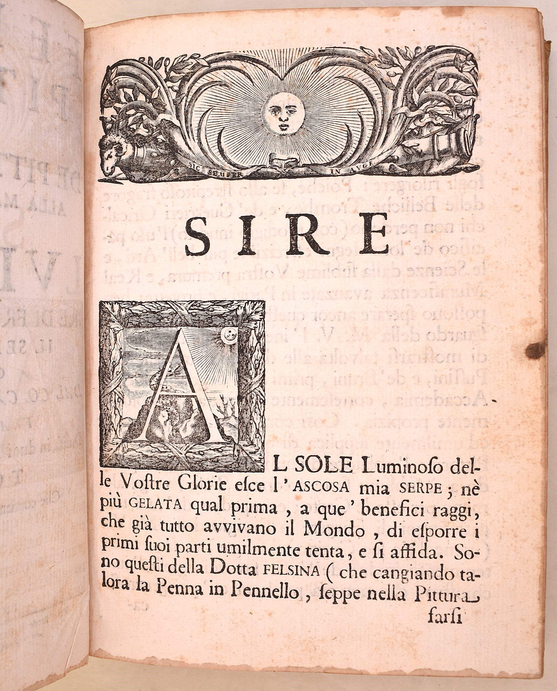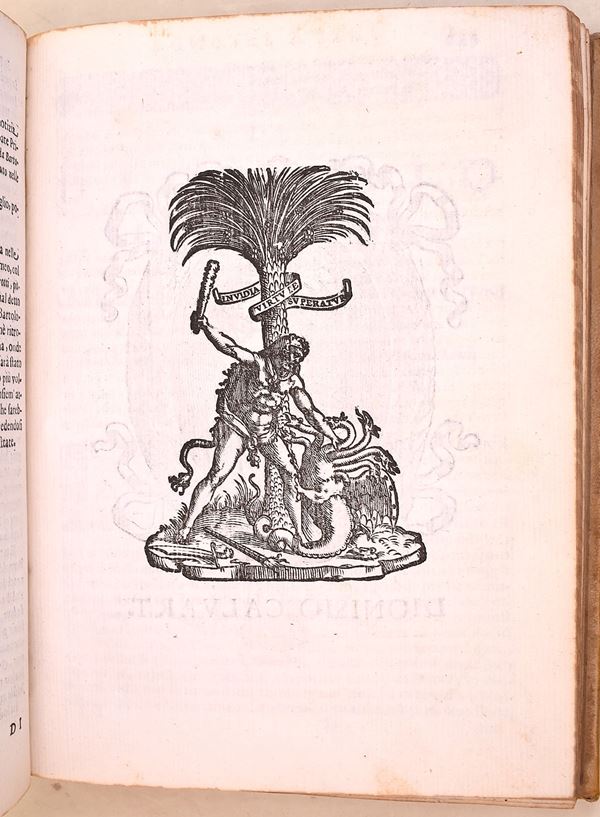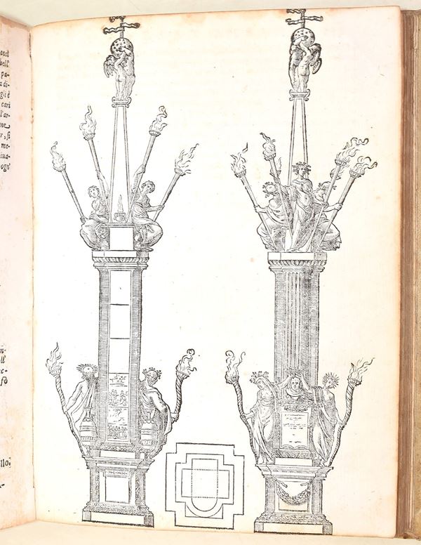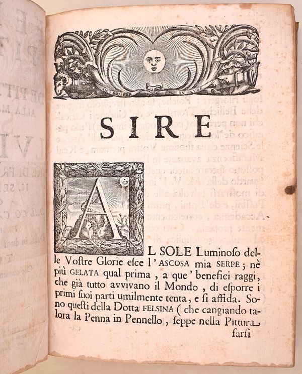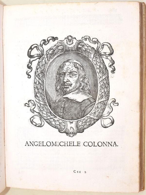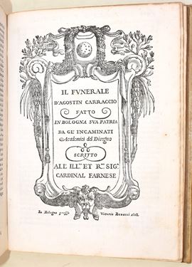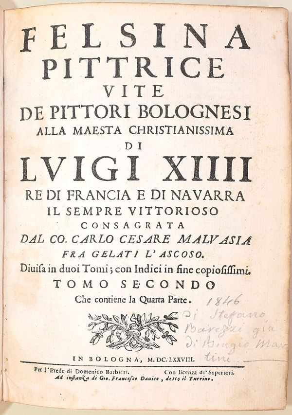 Bologna, per l'erede di Domenico Barbieri: ad instanza di Gio. Francesco Davico detto il Turrino, 1678. Opera in 2 volumi. In-4° (221x164mm). Pagine: (18), 581, (2) / (4), 606, (2). Legatura in piena pergamena. Dorso liscio con un tassello recante autore e titolo in oro. Fregio xilografico sul frontespizio. Iniziali e fregi xilografici. Opera adorna da 50 ritratti, a raffigurare gli artisti descritti nel testo. Quasi tutti i ritratti sono in cornice ovale, otto delle quali non contengono la raffigurazione del relativo artista. Numerose altre incisioni, anche a piena pagina, a raffigurare elementi allegorici, particolari di dipinti, stemmi, monumenti, oltre a svariati cartigli ornamentali, a varie tavole a illustrare il "funerale di Agostin Carraccio" e all'albero genealogico dei Carracci, con ai piedi vedutina di Bologna. Esemplare in barbe.