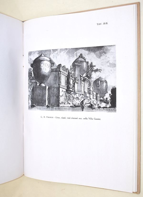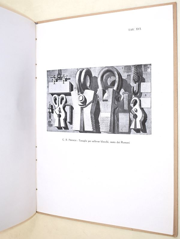 Mariani, Valerio: Studiando Piranesi, Roma, Fratelli Palombi Editori, 1938. In-4° (292x216 mm). Pagine: 52 + XVI tavole in bianco e nero. Copertina rigida in cartonato editoriale con illustrazione apposta al piatto anteriore. Ottimo stato complessivo.