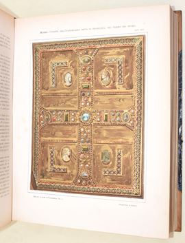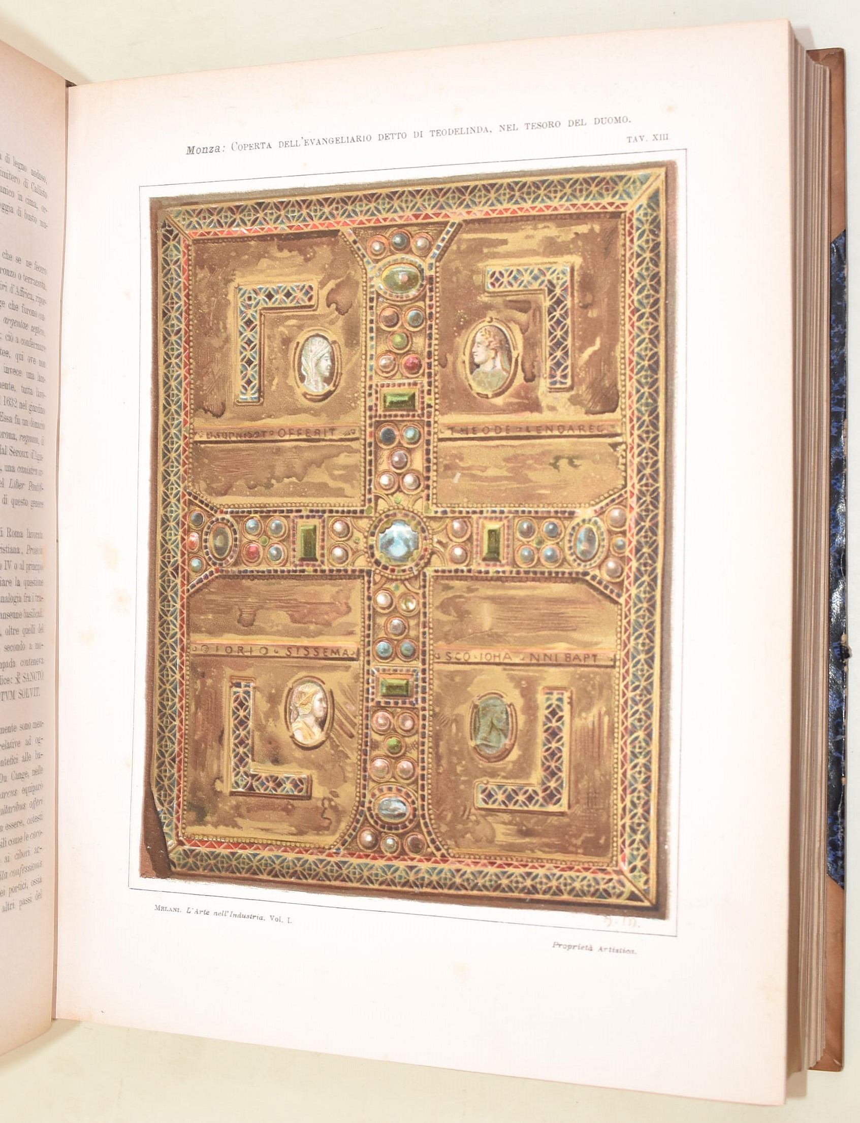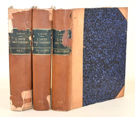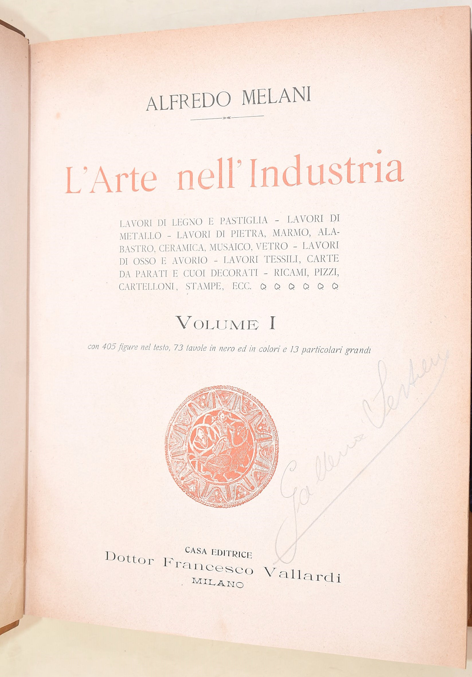 Milano, Casa Editrice Dottor Francesco Vallardi, s.d. (primo ‘900). In-4° (295x215 mm). 3 volumi. Pagine: XIV, 512 / 671 / CLX tavole. Volumi riccamente illustrati. Il primo volume presenta 9 tavole doppie. Il terzo volume è composto solo da tavole. Copertina rigida in mezza similpergamena con angoli e piatti marmorizzati. Danni e segni del tempo alle rilegature.Opera di Alfredo Melani dedicata al rapporto tra arti decorative e produzione industriale tra Otto e primo Novecento. I tre volumi analizzano materiali, tecniche e modelli estetici applicati all’industria artistica, con ampio spazio a oggetti d’arredo, arti applicate e manifatture. Riccamente illustrata con numerose tavole, l’opera rappresenta una significativa testimonianza della cultura artistica e del dibattito sul rapporto tra arte e industria nell’età moderna.