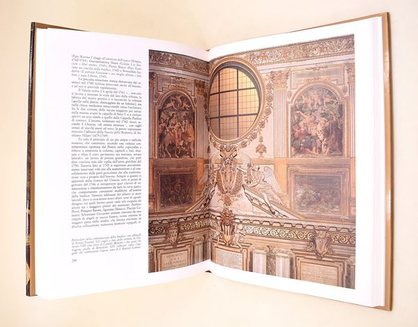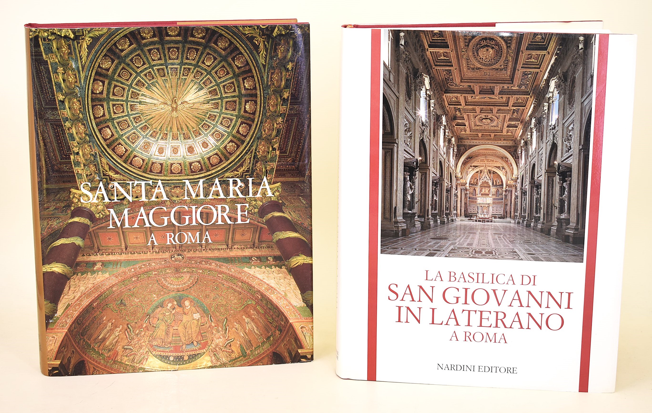 Pietrangeli, Carlo: La Basilica di Santa Maria Maggiore a Roma, Firenze, Nardini Editore, 1997. In-4° (315x243 mm). Pagine: 334. Copertina rigida in piena tela con sovracoperta. Edizione illustrata. Ottimo stato di conservazione.Nel volume Carlo Pietrangeli ricostruisce con rigore storico e sensibilità critica la vicenda millenaria della Basilica di Santa Maria Maggiore, una delle quattro basiliche papali di Roma. L’autore analizza le diverse fasi costruttive, dagli impianti paleocristiani agli interventi medievali e barocchi, soffermandosi sui celebri mosaici, sulle cappelle gentilizie e sulle committenze pontificie. Il libro intreccia storia dell’arte, liturgia e storia urbana, evidenziando il ruolo centrale della basilica nella vita religiosa e culturale della città. Il ricco apparato illustrativo supporta un’indagine approfondita e scientificamente fondata.Pietrangeli, Carlo: La Basilica di San Giovanni in Laterano a Roma, Firenze, Nardini Editore, 1991. In-4° (315x243 mm). Pagine: 336. Copertina rigida in piena tela con sovracoperta. Edizione illustrata. Ottimo stato di conservazione.Nel volume dedicato alla Basilica di San Giovanni in Laterano, Carlo Pietrangeli ricostruisce la storia della cattedrale di Roma, madre e capo di tutte le chiese dell’Urbe e dell’orbe cattolico. L’autore analizza le origini costantiniane, le trasformazioni medievali e i grandi interventi rinascimentali e barocchi, con particolare attenzione al rifacimento borrominiano e al ciclo scultoreo degli Apostoli. Il testo intreccia storia architettonica, vicende papali e significato liturgico, offrendo una lettura completa del complesso lateranense. Il ricco apparato iconografico sostiene un’indagine accurata e scientificamente fondata.