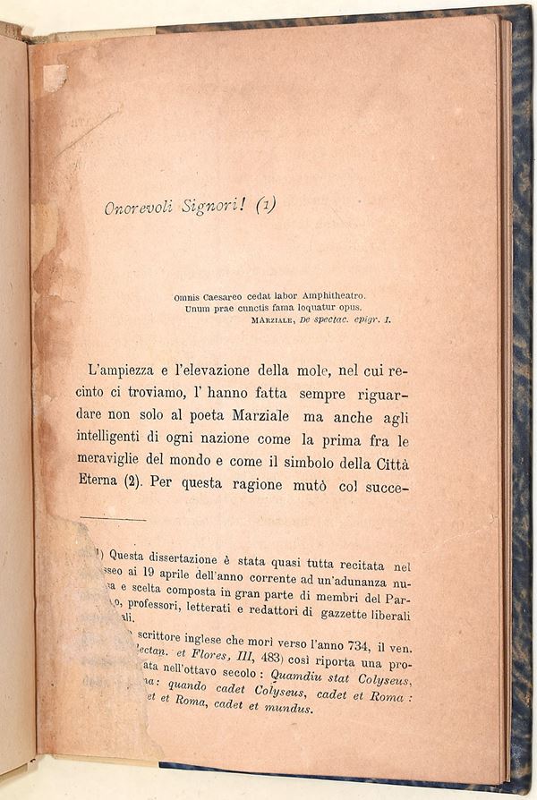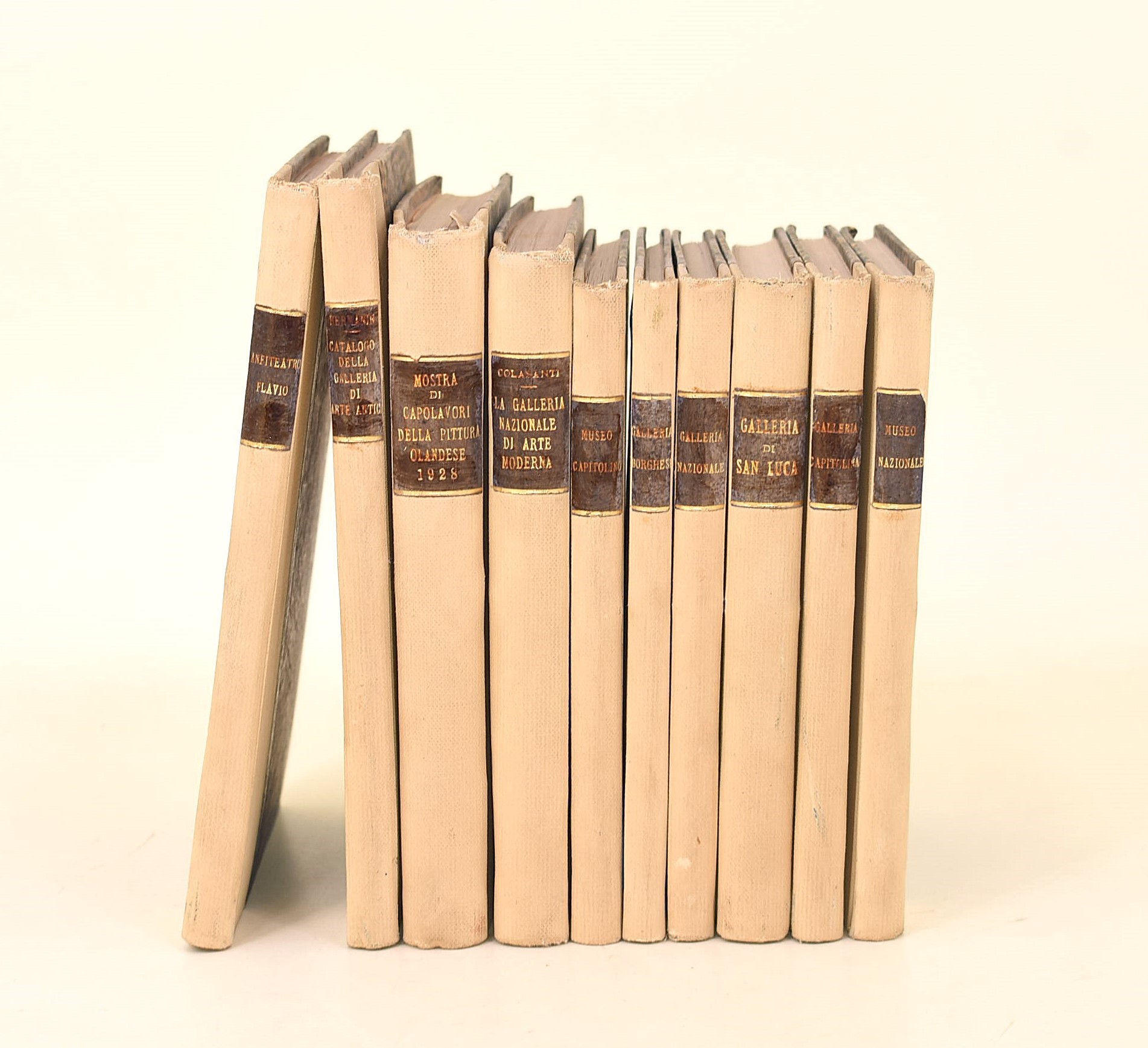 10 volumi. In-16°. Rilegatura in mezza tela con titoli in oro su tasselli al dorso. Piatti in carta marmorizzata. In buono stato complessivo. Interessante raccolta composta da 9 cataloghi di mostre d’arte e 1 saggio storico dedicato al Colosseo (esemplare privo di frontespizio).