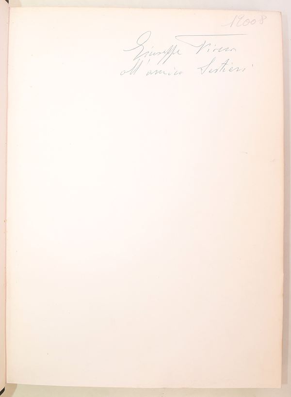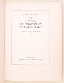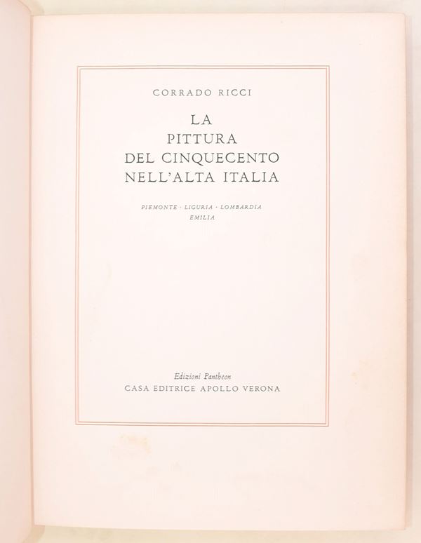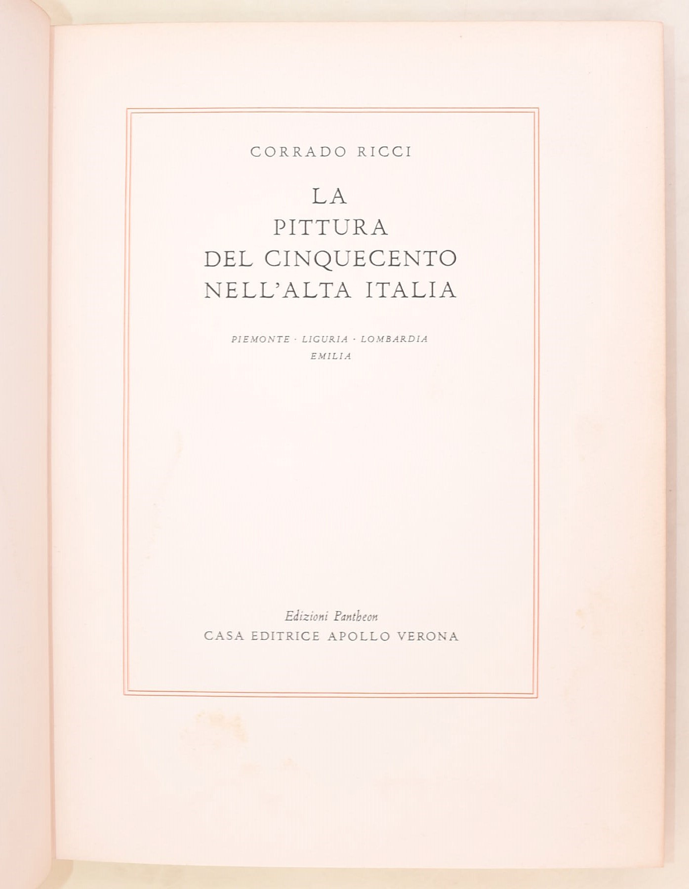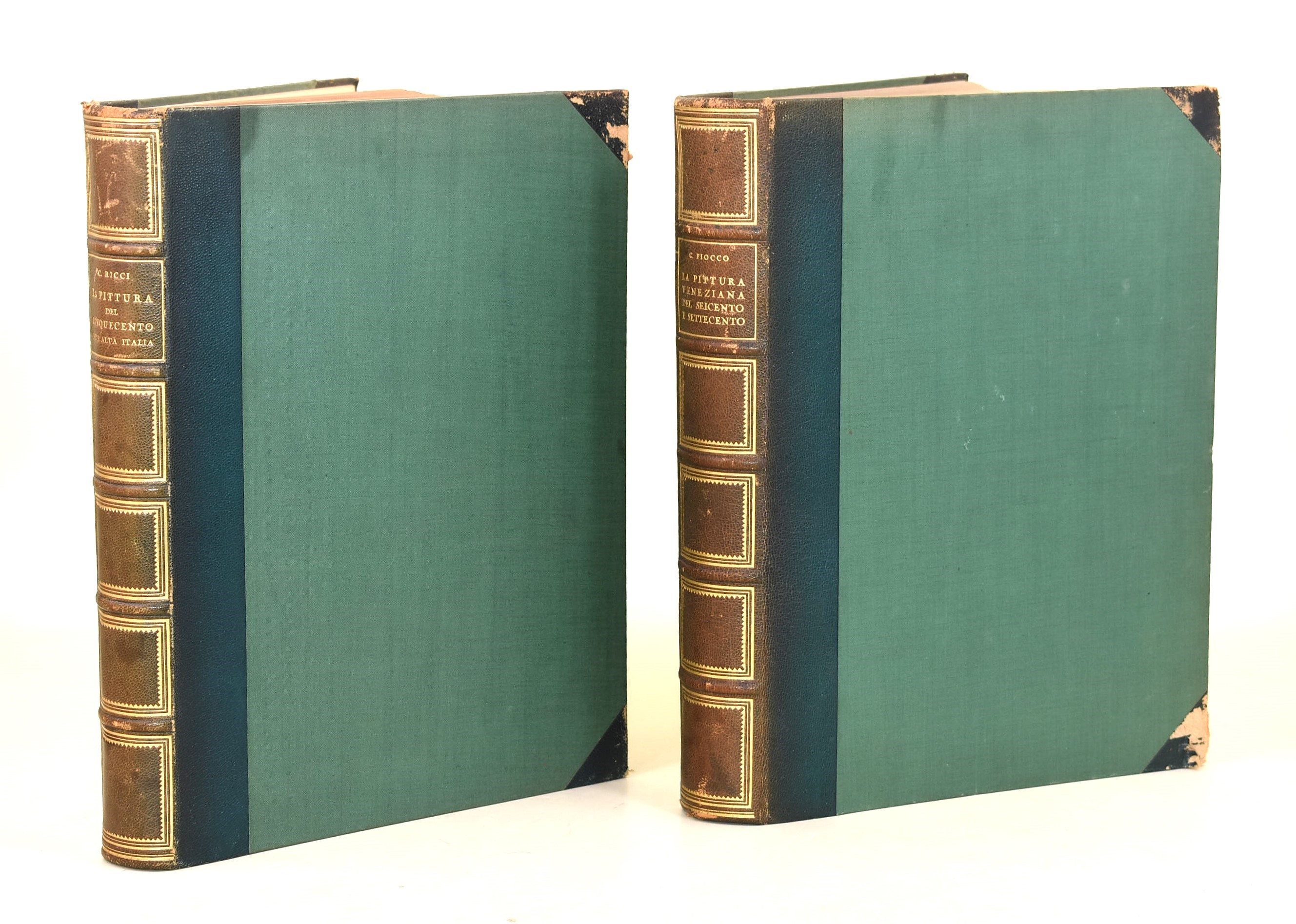 Ricci, Corrado: La pittura del Cinquecento nell’Alta Italia, Firenze, Edizioni Pantheon, 1928. In-4° (313x232 mm). Pagine: VIII, 60. Volume di 84 tavole illustrazioni in bianco e nero precedute da una pagina introduttiva. Rilegatura in mezza pelle con angoli e piatti in tela. Dorso con 5 nervi, titolo, autore e fregi in oro. Lievi segni del tempo.Nel volume La pittura del Cinquecento nell’Alta Italia, Corrado Ricci propone una sintesi chiara ed efficace della produzione artistica dell’Italia settentrionale nel XVI secolo. L’autore delinea i caratteri distintivi delle scuole veneta, lombarda ed emiliana, evidenziando personalità e sviluppi stilistici nel contesto del Rinascimento maturo. Il testo introduttivo, agile ma denso, è accompagnato da un ricco apparato di 84 tavole in bianco e nero che documentano opere significative del periodo. L’opera costituisce una testimonianza importante della storiografia artistica italiana del primo Novecento, con un taglio divulgativo ma fondato su solide competenze critiche.Fiocco, Giuseppe: La Pittura Veneziana del Seicento e Settecento, Firenze, Edizioni Pantheon, 1929. In-4° (313x232 mm). Pagine: IX, 108. Volume di 88 tavole illustrazioni in bianco e nero precedute da una pagina introduttiva. Rilegatura in mezza pelle con angoli e piatti in tela. Dorso con 5 nervi, titolo, autore e fregi in oro. Lievi segni del tempo. Firma di Giuseppe Fiocco per Sestieri. Nel volume La Pittura Veneziana del Seicento e Settecento, Giuseppe Fiocco offre una sintesi autorevole sulla stagione barocca e rococò della scuola veneziana. L’autore analizza l’evoluzione stilistica dalla grande tradizione seicentesca fino ai protagonisti del Settecento, soffermandosi su maestri come Pietro della Vecchia, Sebastiano Ricci, Tiepolo e Canaletto. Il testo introduttivo, chiaro e denso, è accompagnato da un ampio apparato di 88 tavole in bianco e nero che documentano opere significative del periodo. L’opera rappresenta una testimonianza importante della storiografia artistica italiana del primo Novecento dedicata alla pittura veneta.