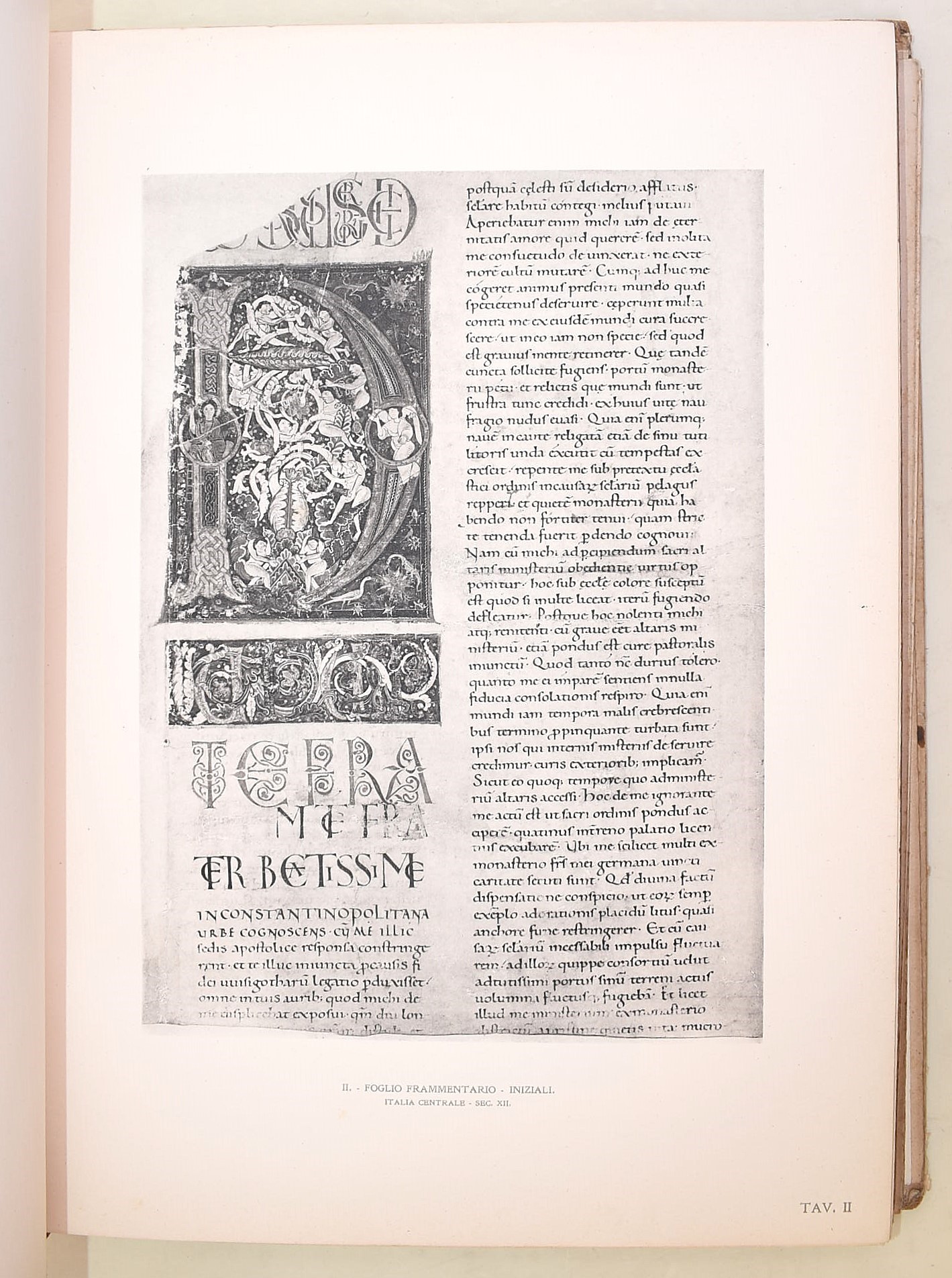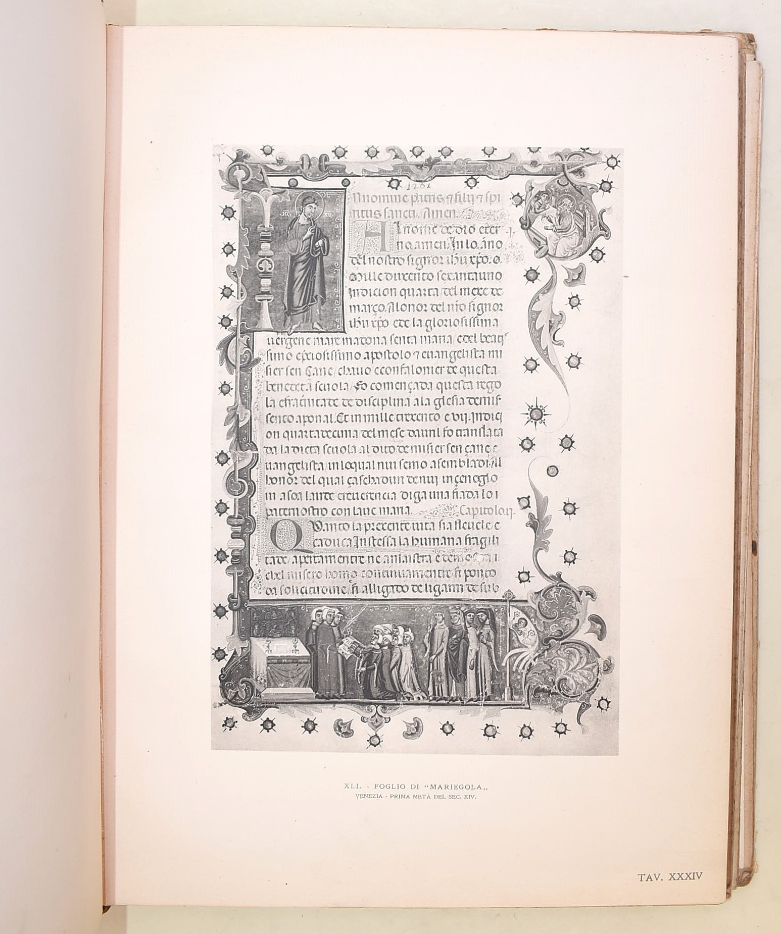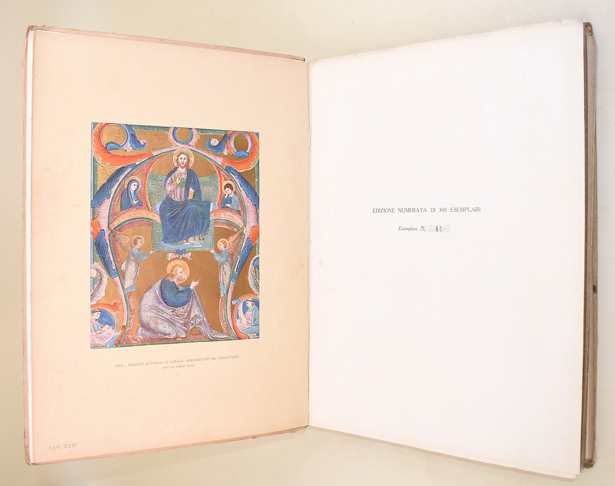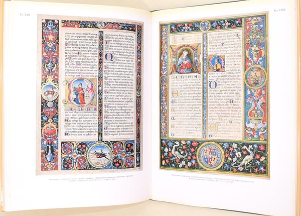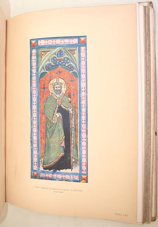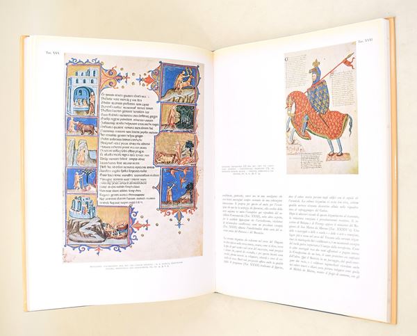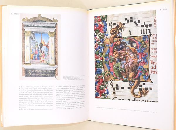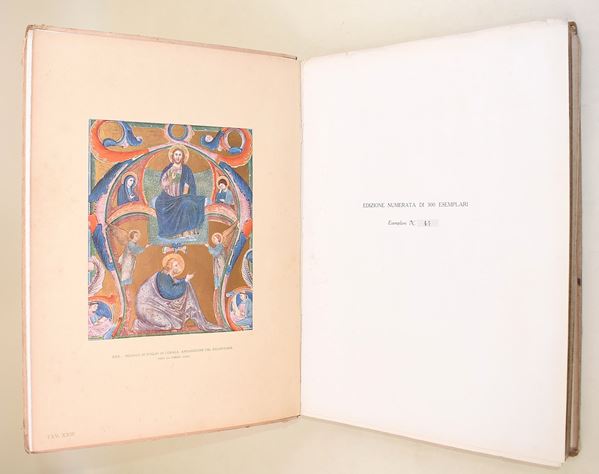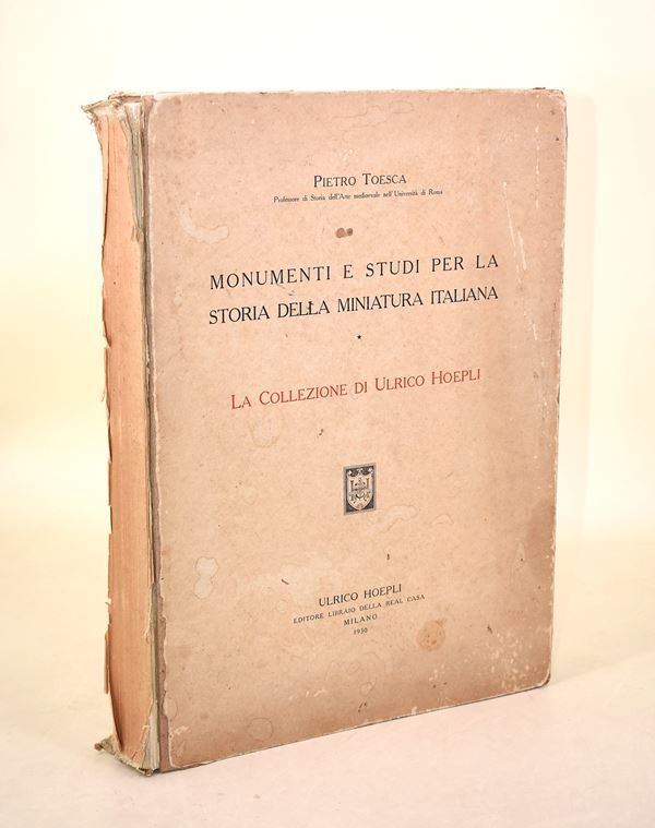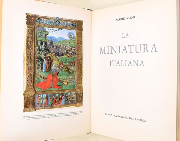 Salmi, Mario: La miniatura italiana, Milano, Electa Editrice, 1955. In-4° (315x237 mm). Pagine: 151 + LXXVIII tavole a colori. Copertina rigida in piena tela editoriale con sovracoperta. Edizione illustrata. Buono stato complessivo, ad eccezione di piccoli segni del tempo. Toesca, Pietro: Monumenti e studi per la storia della miniatura italiana, Milano, Ulrico Hoepli, 1930. In folio (391x281 mm). Pagine: 154 + CLIII tavole. Esemplare: n. 44 di 300. Difetti alla legatura che risulta allentata. Frontespizio mancante. Importante lotto dedicato alla miniatura italiana, che riunisce due fondamentali studi storico-artistici sul tema. Il volume di Mario Salmi (La miniatura italiana, Electa, 1955) offre una sintesi chiara e riccamente illustrata dello sviluppo dell’arte miniata in Italia, mentre l’opera di Pietro Toesca (Monumenti e studi per la storia della miniatura italiana, Hoepli, 1930), in tiratura limitata, rappresenta uno dei contributi più autorevoli e approfonditi, corredato da un ampio apparato di tavole. Insieme costituiscono un nucleo di grande interesse per lo studio della miniatura medievale e rinascimentale, tra sintesi divulgativa e rigorosa indagine critica.