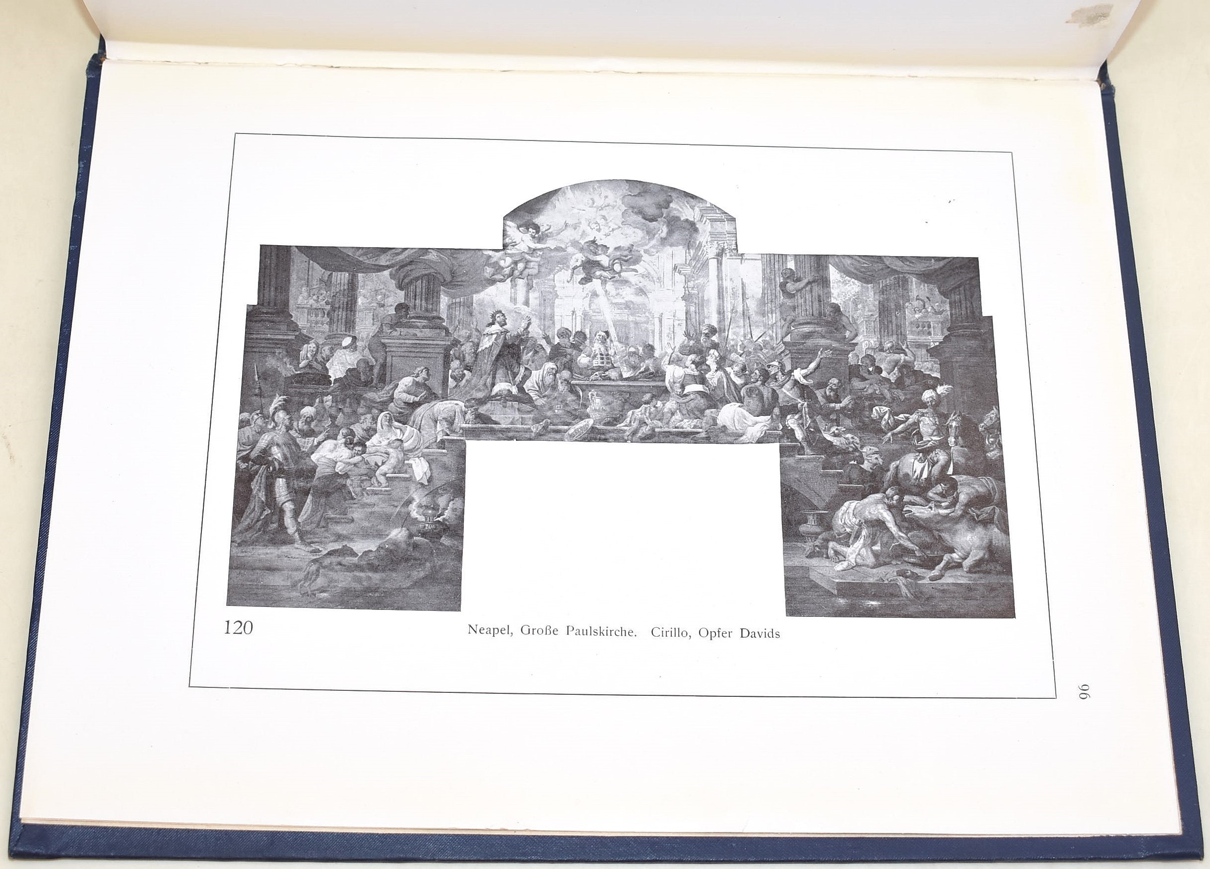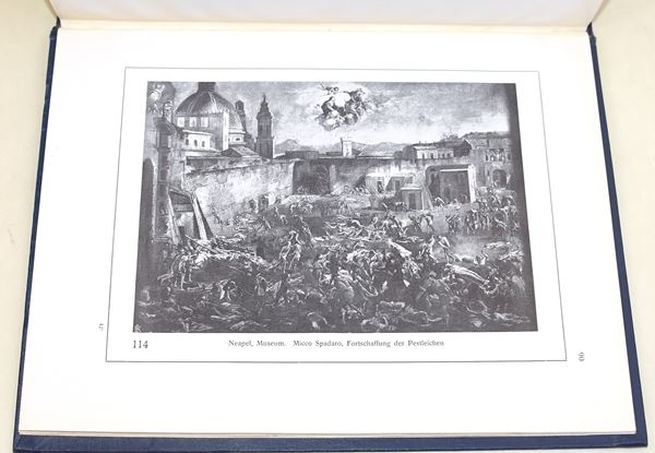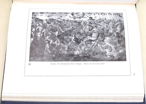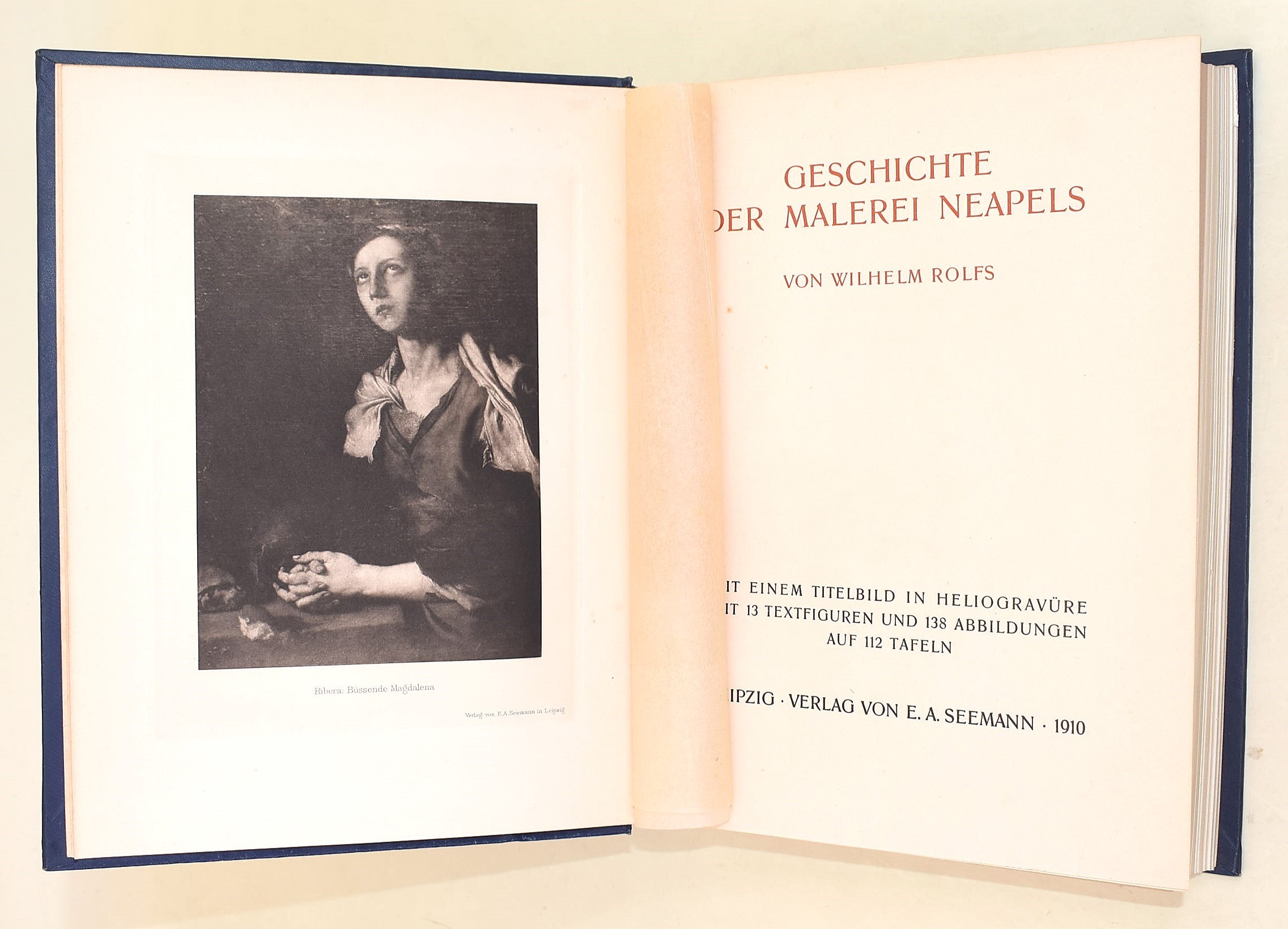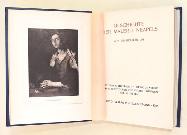 Rolfs, Von Wilhelm: Geschichte der malerei Neapels, Leipzig, Verlag Von E.A. Seemann, 1910. In-8° (260x204 mm). Pagine: 440 + 96 carte con 120 illustrazioni in bianco e nero. Copertina rigida in piena tela. Dorso con autore e titolo in oro. Testo in tedesco.