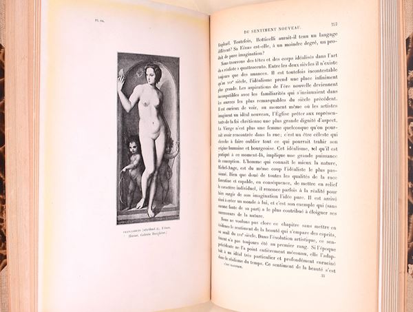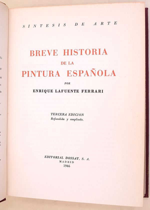 Wölfflin, H.: L’art classique initiation au génie de la renaissance italienne, Parigi, Librairie Renouard, H. Laurens Éditeur, 1911. In-8° (250x172 mm). Pagine: VIII, 343. Rilegatura in mezza pelle con angoli e piatti in carta decorata. Edizione illustrata. Testo in francese. In L’art classique. Initiation au génie de la Renaissance italienne, Heinrich Wölfflin propone una lettura innovativa della cultura figurativa rinascimentale, analizzandone i principi formali e il concetto di “classico” come espressione di equilibrio, armonia e chiarezza strutturale. L’autore indaga l’evoluzione dell’arte italiana tra Quattrocento e primo Cinquecento, soffermandosi su maestri come Leonardo, Raffaello e Michelangelo. Attraverso un metodo fondato sull’analisi stilistica comparata, Wölfflin offre una delle prime interpretazioni moderne del linguaggio rinascimentale. Il volume, riccamente illustrato, rappresenta un testo fondamentale della storiografia artistica del primo Novecento. Lafuente Ferrari, Enrique: Breve Historia de la Pintura Española, Madrid, Editorial Dossat, 1946. In-8° (221x160 mm). Pagine: 551. Copertina rigida in piena tela. Edizione illustrata. Testo in spagnolo. In Breve Historia de la Pintura Española, Enrique Lafuente Ferrari offre una sintesi ampia e rigorosa dell’evoluzione della pittura spagnola dalle origini medievali fino all’età contemporanea. Il volume ripercorre le principali scuole e i grandi maestri – da El Greco a Velázquez, da Zurbarán a Goya – mettendone in luce caratteri stilistici, contesti storici e sviluppi iconografici. L’autore coniuga chiarezza divulgativa e solidità scientifica, rendendo l’opera uno strumento fondamentale per la conoscenza dell’arte spagnola. L’apparato illustrativo accompagna il testo con immagini esemplificative dei capolavori analizzati.