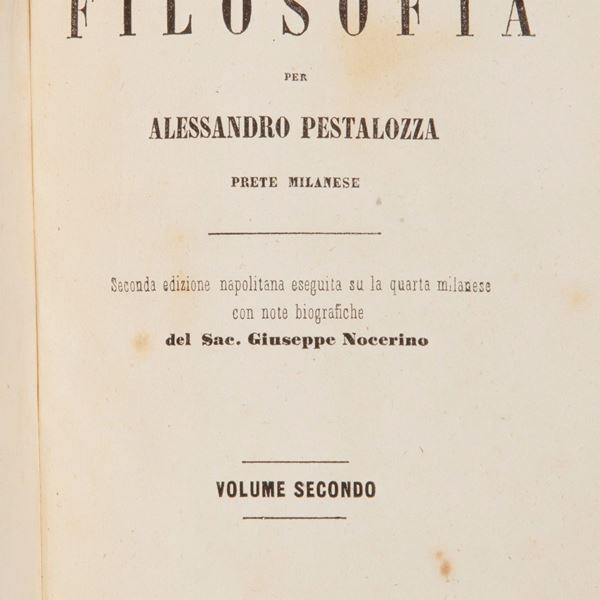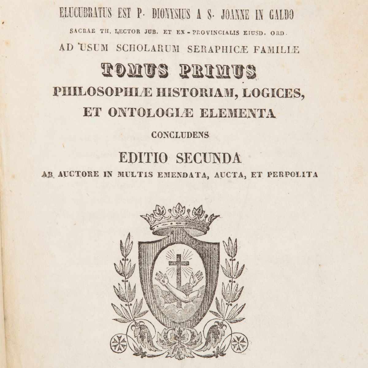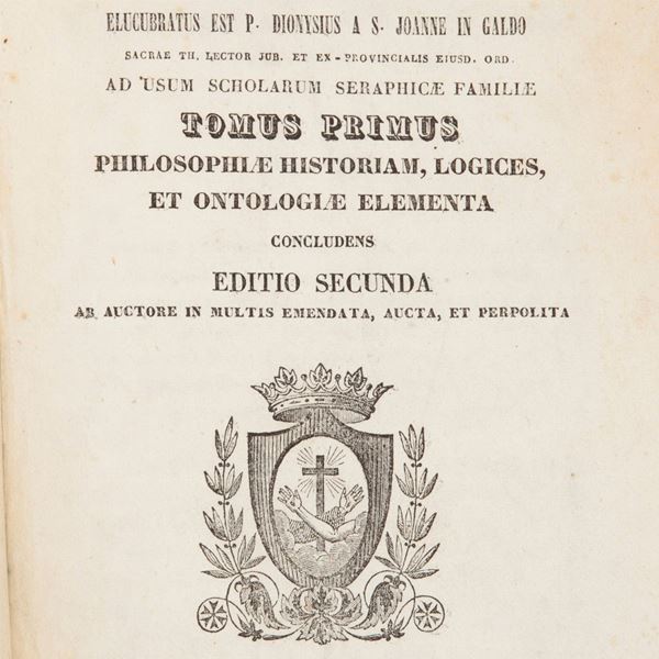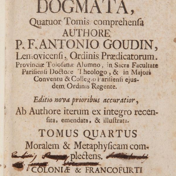 Insieme a 4) Alessandro Pestalozza, Elementi di Filosofia, Napoli 1860 (solo Volume secondo); 5) Antonio Goudin, Philosophia juxta inconcussa tutissimaque Divi Thomae Dogmata, Colonia e Francoforte 1764 (solo Tomo IV). Legature in mezza pelle e piena pergamena. Lotto non passibile di restituzione.