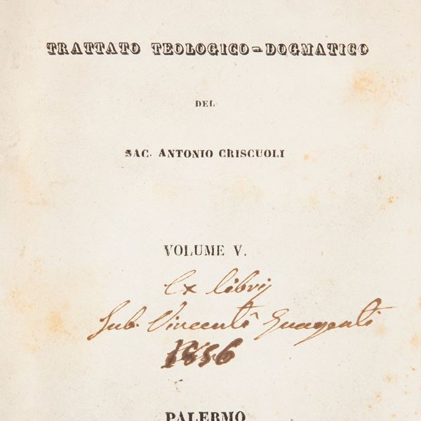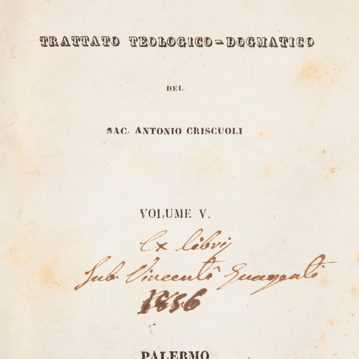Antonio Criscuoli - Istituzione di Dogmatica Teologia 5 Volumi: - Per la Teologia dogmatica; - Di Dio Trattato Teologico-Dogmatico; - Della Creazione; - Della Incarnazione; - Della Grazia, Orotea, Palermo 1840-1843