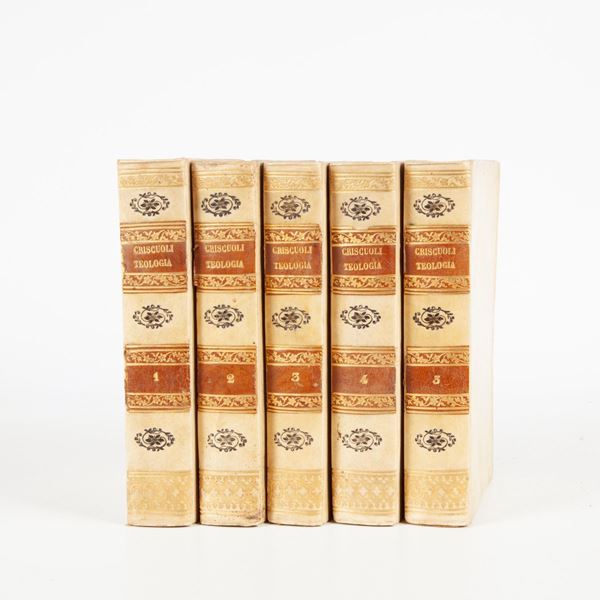 In 8°. 5 volumi. Legature in piena pergamena coeva con tasselli di pelle e fregi in oro ai dorsi.