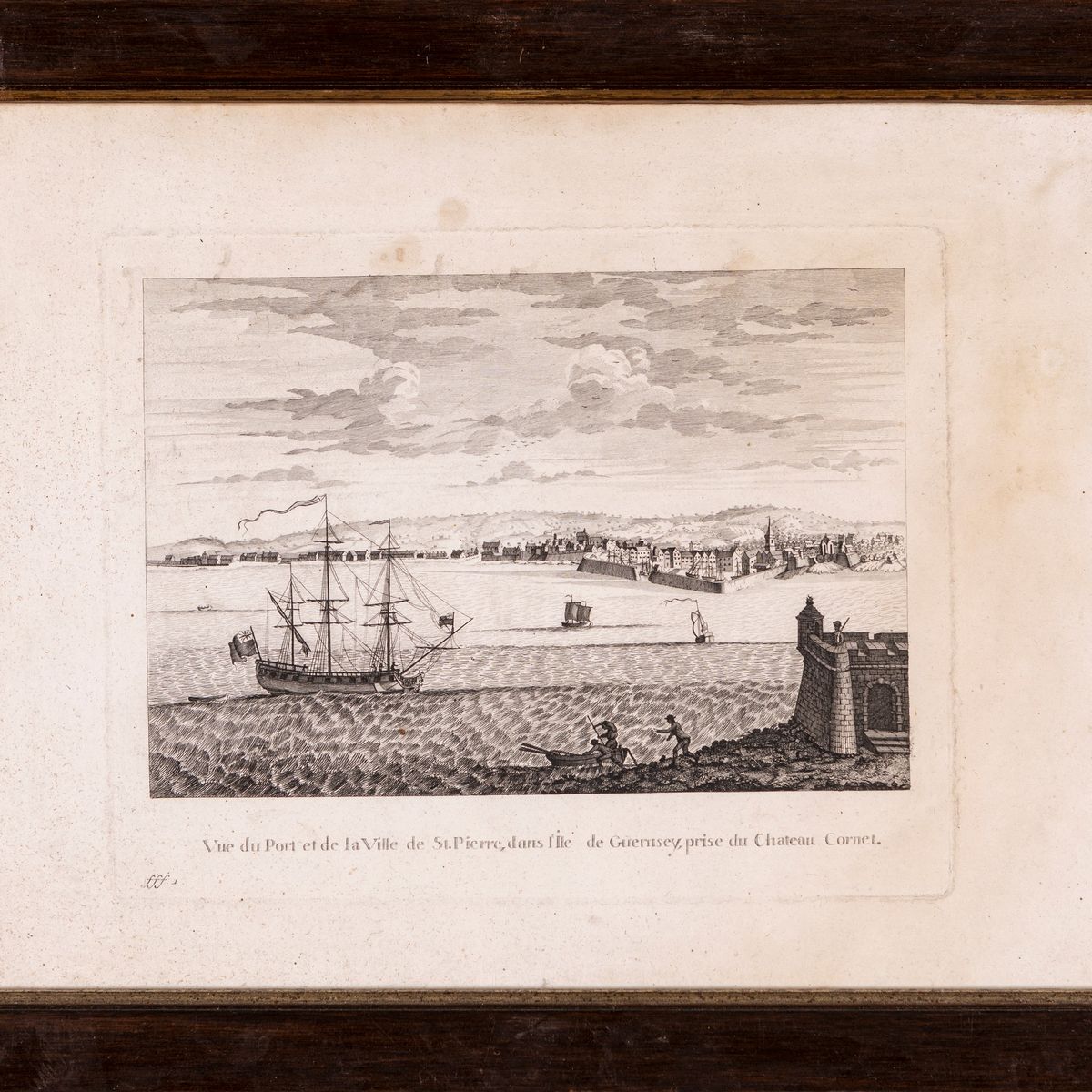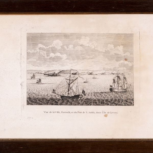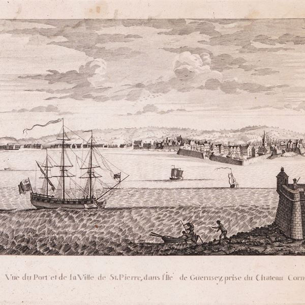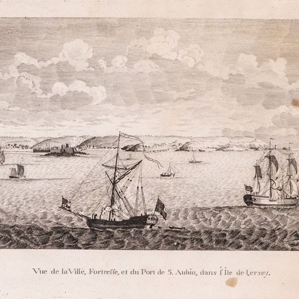 Coppia di incisioni del XVIII secolo: a) Vue de la Ville, Fortresse, et du Port de S.Aubin, dans l'Ile de Jersey; b) Vue du Port et de la Ville de St. Pierre, dans l'Ile de Guernsey, prise du Chateau Cornet