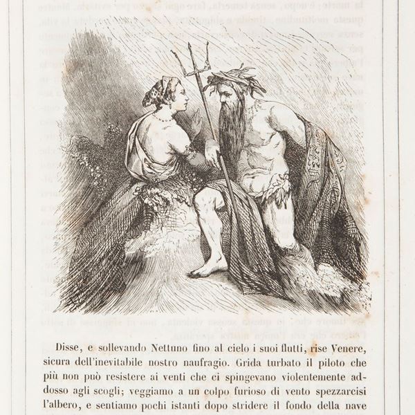 In 8° grande. Con 12 pregevoli illustrazioni a piena pagina e numerosissime illustrazioni nel testo. Ritratto dell'autore in antiporta. Traduzione della celebre e fortunatissima opera di Fenelon (1651-1715) apparsa per la prima volta clandestinamente a Parigi nel 1699 e quindi più volte ristampata quale manifesto delle idee pedagogiche e politiche dell'autore. Questa edizione a cura della società costituita tra Alessandro Fontana e l'attivissimo Giuseppe Pomba si segnala per la finezza delle illustrazioni. Legatura in mezza pelle con titoli e fregi al dorso e piatti in tela incisa.
