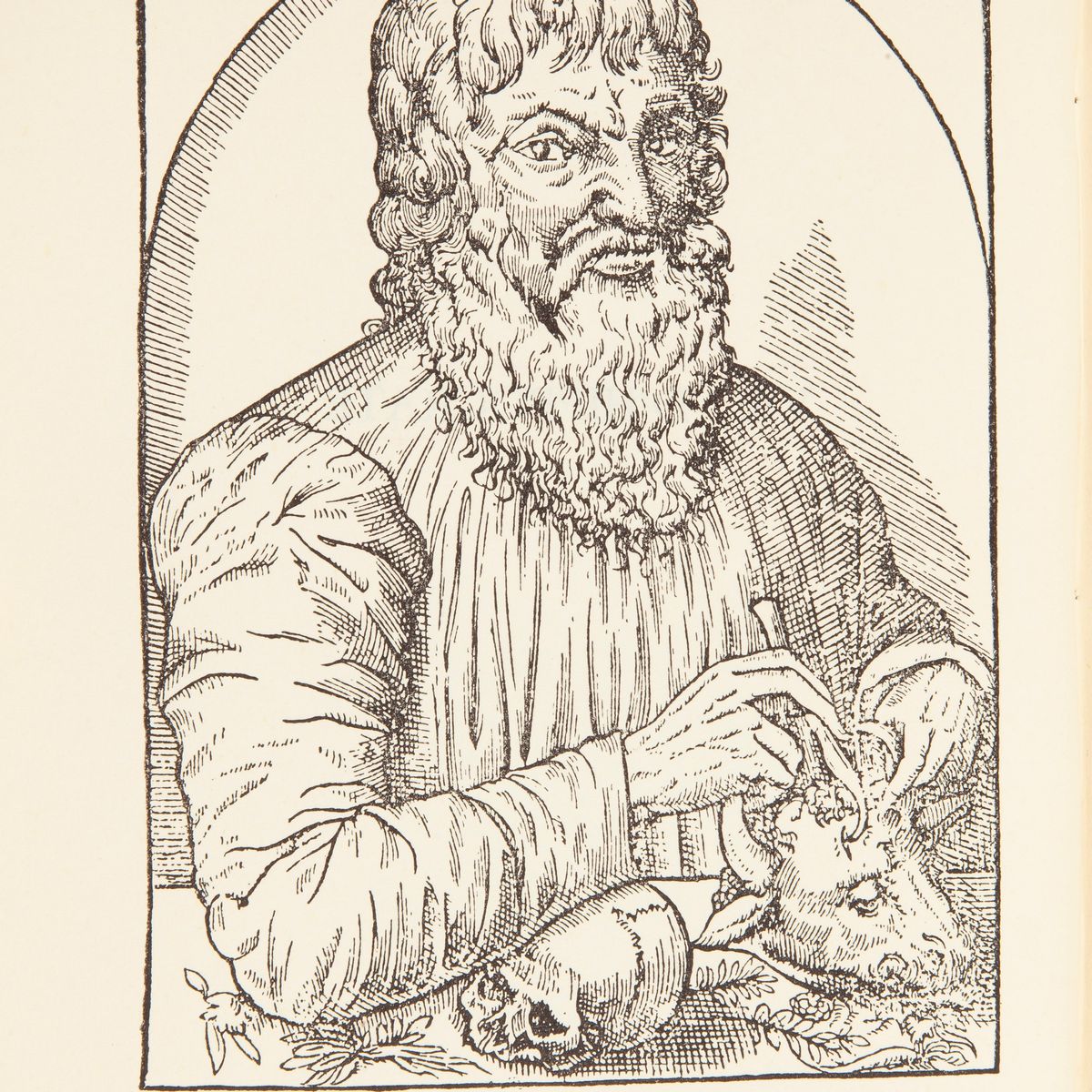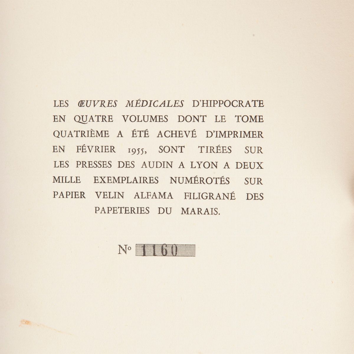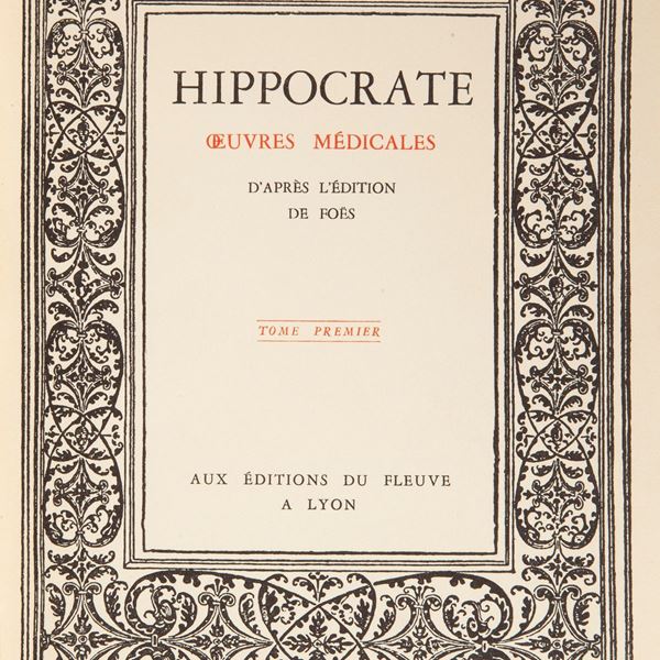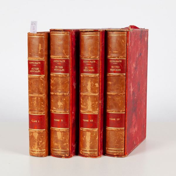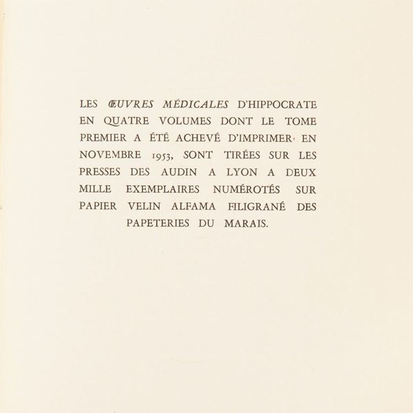 4 Volumi illustrati entro cofanetti marmorizzati. Edizione in lingua francese che riprende quella cinquecentesca delle opere di Ippocrate curata da Anuce Foes. Tiratura limitata a 2.000 esemplari stampati su carta Alfama filigranata della Cartiera du Marais. Ns. esemplare n. 1160. Legature in pena pelle a 5 nervi con titoli in oro al dorso.