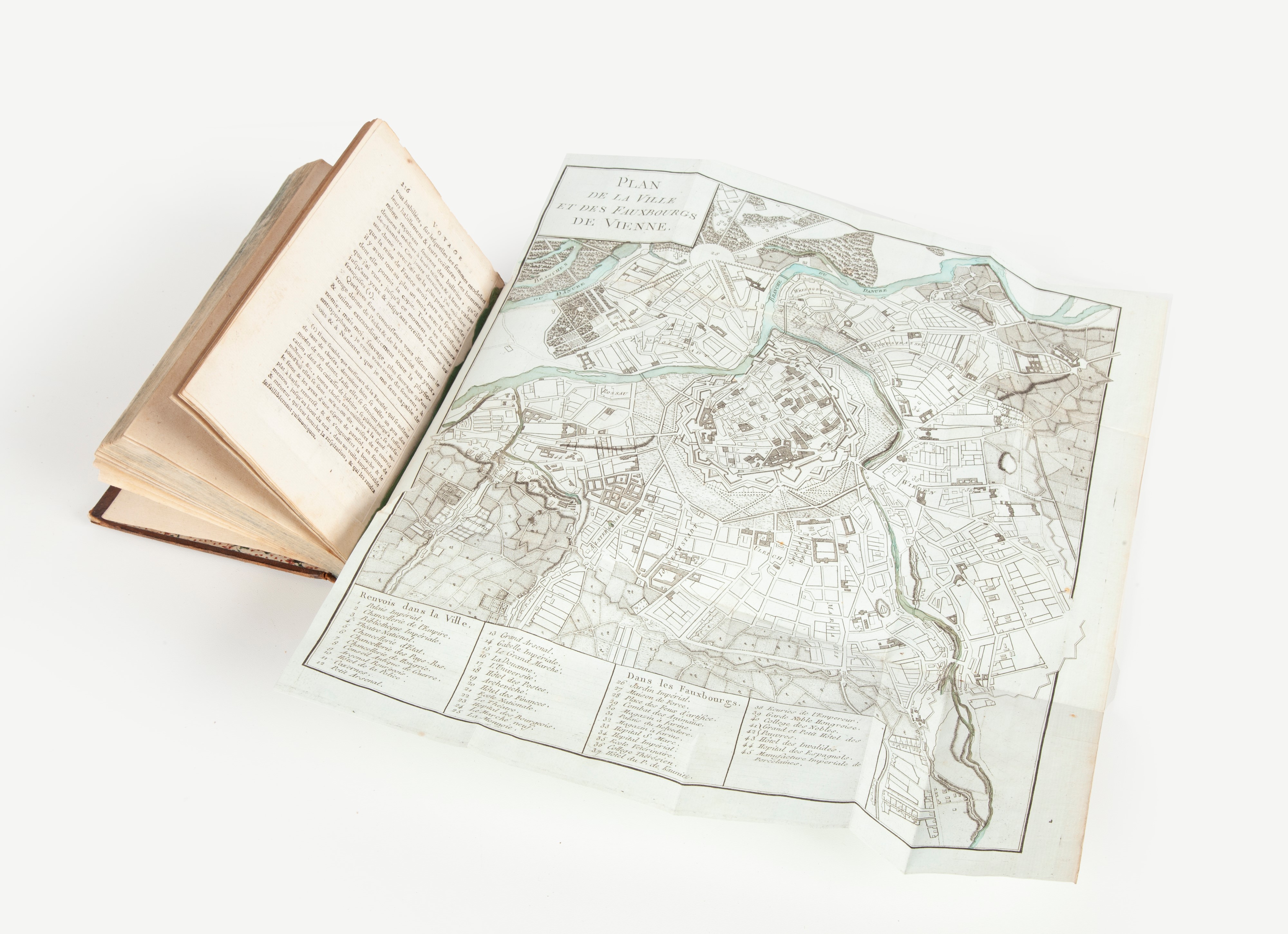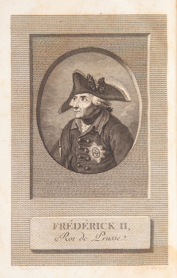In 8°. Solo primo e secondo volume su 3. Legatura in piena pelle coeva con titoli e fregi in oro al dorso. Con le incisioni raffiguranti il Ritratto di Federico II re di Prussia, la carta più volte ripiegata della Germania e della Prussia, e la pianta della città di Vienna su carta verde.
