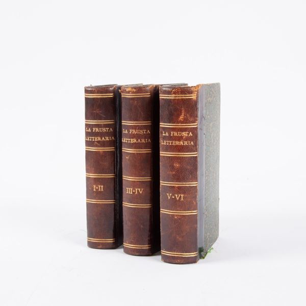 In 16° Edizione postuma della rivista fondata a Venezia nel 1763 ed ivi stampata fino al 1765 (successivamente fu pubblicata ad Ancona), diretta e scritta da Giuseppe Baretti collo pseudonimo di Aristarco Scannabue. Di grande successo per le polemiche e i toni accesi con cui espresse opinioni nei confronti di numerosi letterati a lui contemporanei e del passato. Sei tomi in tre volumi. Legature in mezza pelle coeva con titoli in oro ai dorsi.