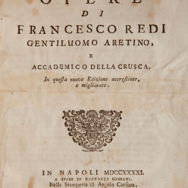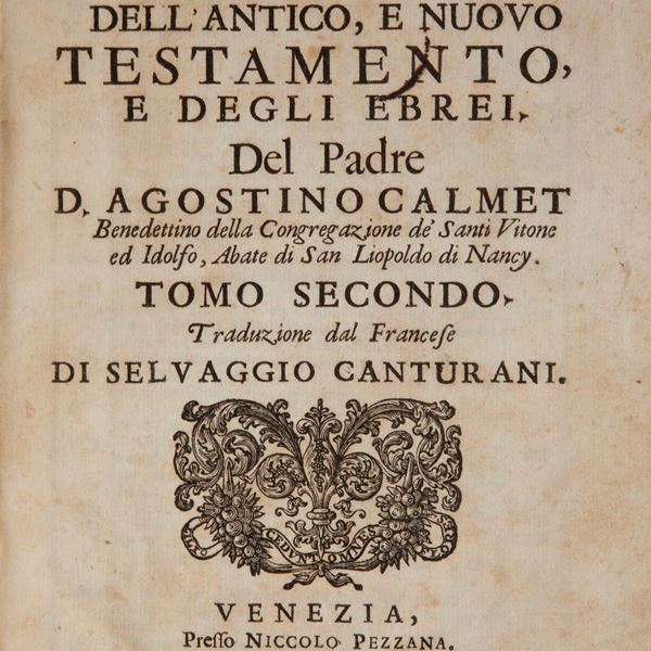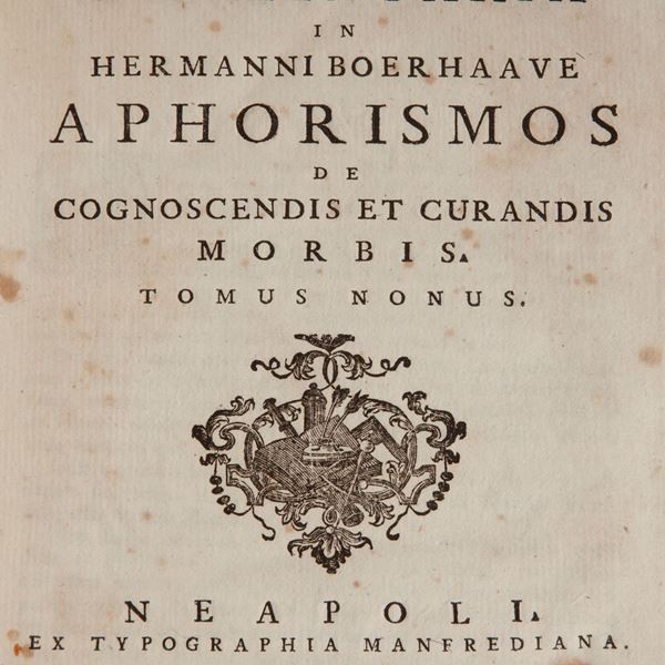 1- Gerardi Van-Swieten. Commentaria in Hermanni Boerhaave aphorismos de cognoscendis et curandis morbis - Tomo IX di dieci. Tipografia Manfrediana, Napoli 1772 - cm. 24,5x18,5. Legatura in piena pergamena coeva, titolo in oro al dorso (difetti). 2- Conyers Middleton. Lettere di Marco Tullio Cicerone a M. Bruto, e di Bruto a Cicerone Tomo V ed ultimo. Vincenzo Manfredi, Napoli 1762 - cm. 19x11,5. Testo a fronte latino/italiano. Legatura in piena pergamena coeva (difetti), con tassello in pelle, titolo fregi in oro al dorso. Tracce di umidità e bruniture. 3- Padre D. Agostino. La storia dell'antico e del nuovo testamento e degli Ebrei - Tomo II di due - Pezzana, Venezia 1732 - cm 24,5x18. Legatura in piena pergamena coeva, titolo in oro al dorso, tagli marmorizzati. 4- Lettere di Francesco Redi - Probabilmente dalle "Opere" stampate a Napoli nel 1741 da Raffaele Gessari - cm 23,3x18. Legatura in piena pergamena coeva con titolo manoscritto al dorso. Evidenti fioriture sparse su tutte le carte. LOTTO NON PASSIBILE DI RESTITUZIONE