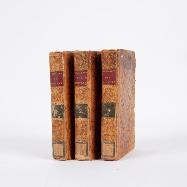 In 12°. Opera didattica del letterato francese (1745-1807), professore de l'École royale militaire fino alla Rivoluzione, nonché maestro di Napoleone Bonaparte. Legature in piena pelle coeva marezzata con tasselli con titoli in oro ai dorsi. Tagli colorati.