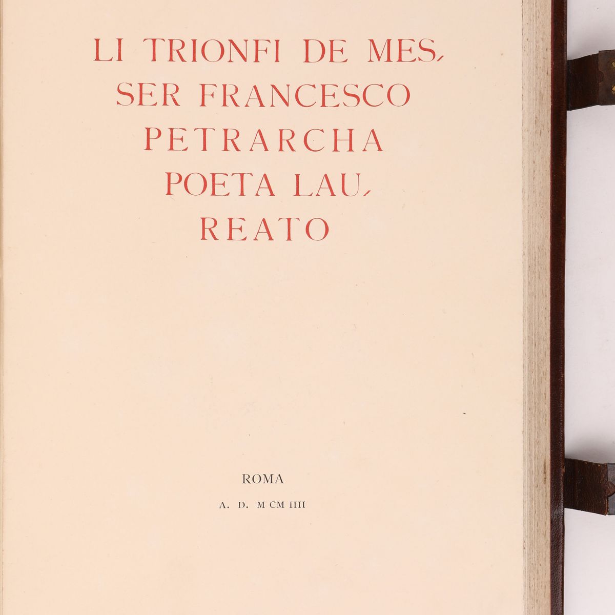 Splendida legatura editoriale in pelle ad opera della Legatoria A. Casciani di Roma dei primi anni del '900 - Li trionfi de Messer Francesco Petrarcha poeta laureato A cura di Nestore Leoni ed Adolfo Venturi, Unione Cooperativa Editrice Roma, 1904