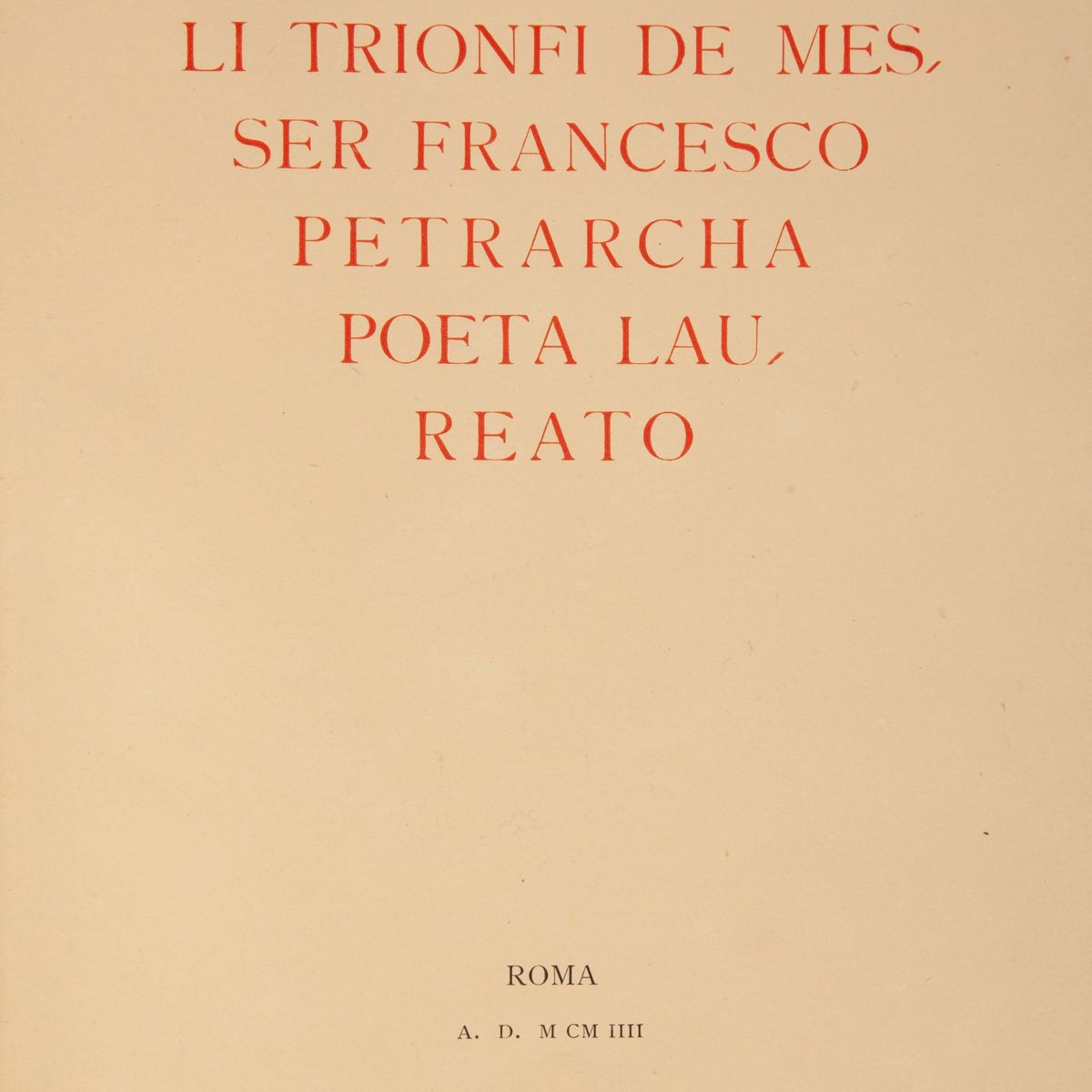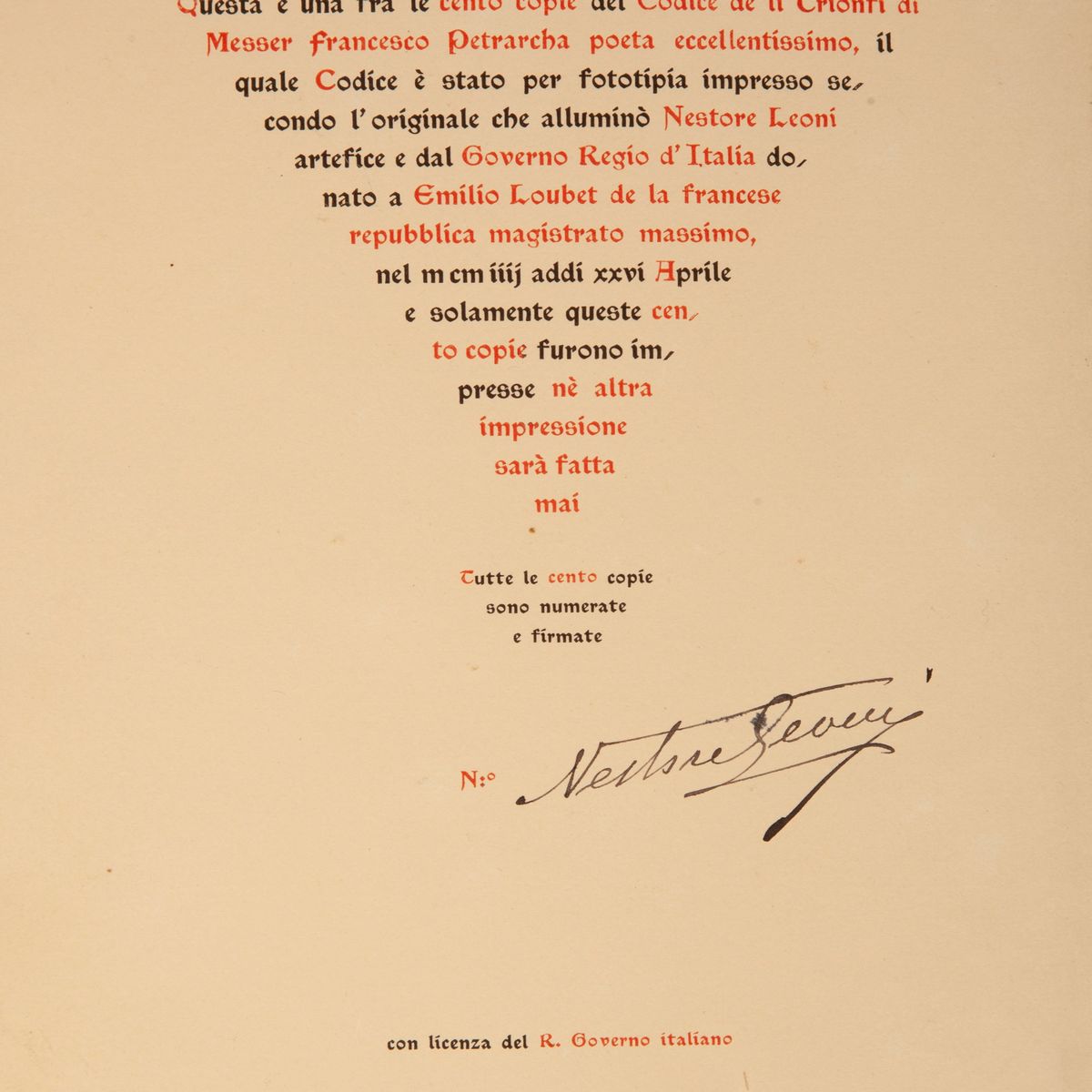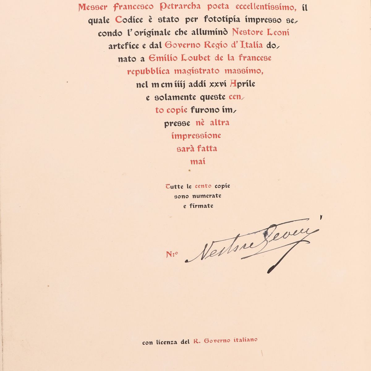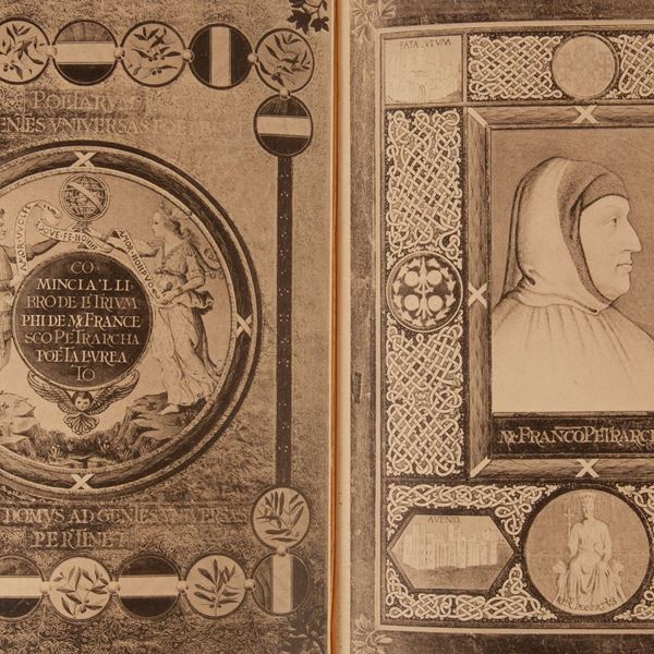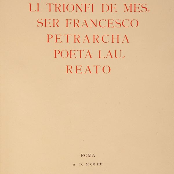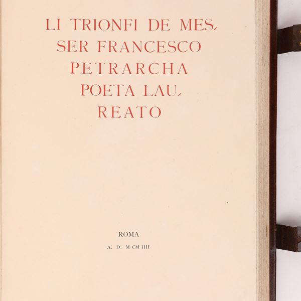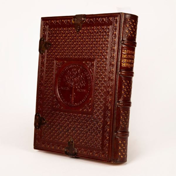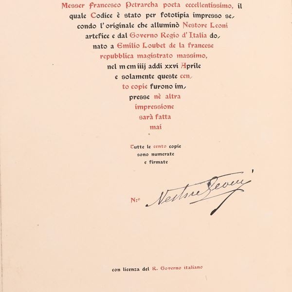 Fac Simile in fototipia realizzato in soli 100 esemplari numerati del manoscritto eseguito dal disegnatore e miniatore Nestore Leoni (1862-1947) e donato dal Governo Italiano al Presidente della Repubblica francese Emilio Loubet nel 1904. Splendida legatura editoriale in pelle ad opera della Legatoria A. Casciani di Roma con ritratto del Petrarca a secco sul piatto. 4 nervi, fregi e titoli a secco ed in oro sui piatti e sul dorso, chiusure in pelle e metallo. Sguardie in seta rossa e taglio superiore dorato. In perfetto stato. Come nuovo. Entro cofanetto originale.