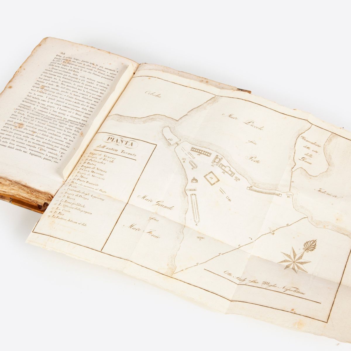 In 4°. Due volumi. Con una pianta di Taranto ripiegata al primo volume. Legature in mezza pelle coeva con doppio tassello ai dorsi.