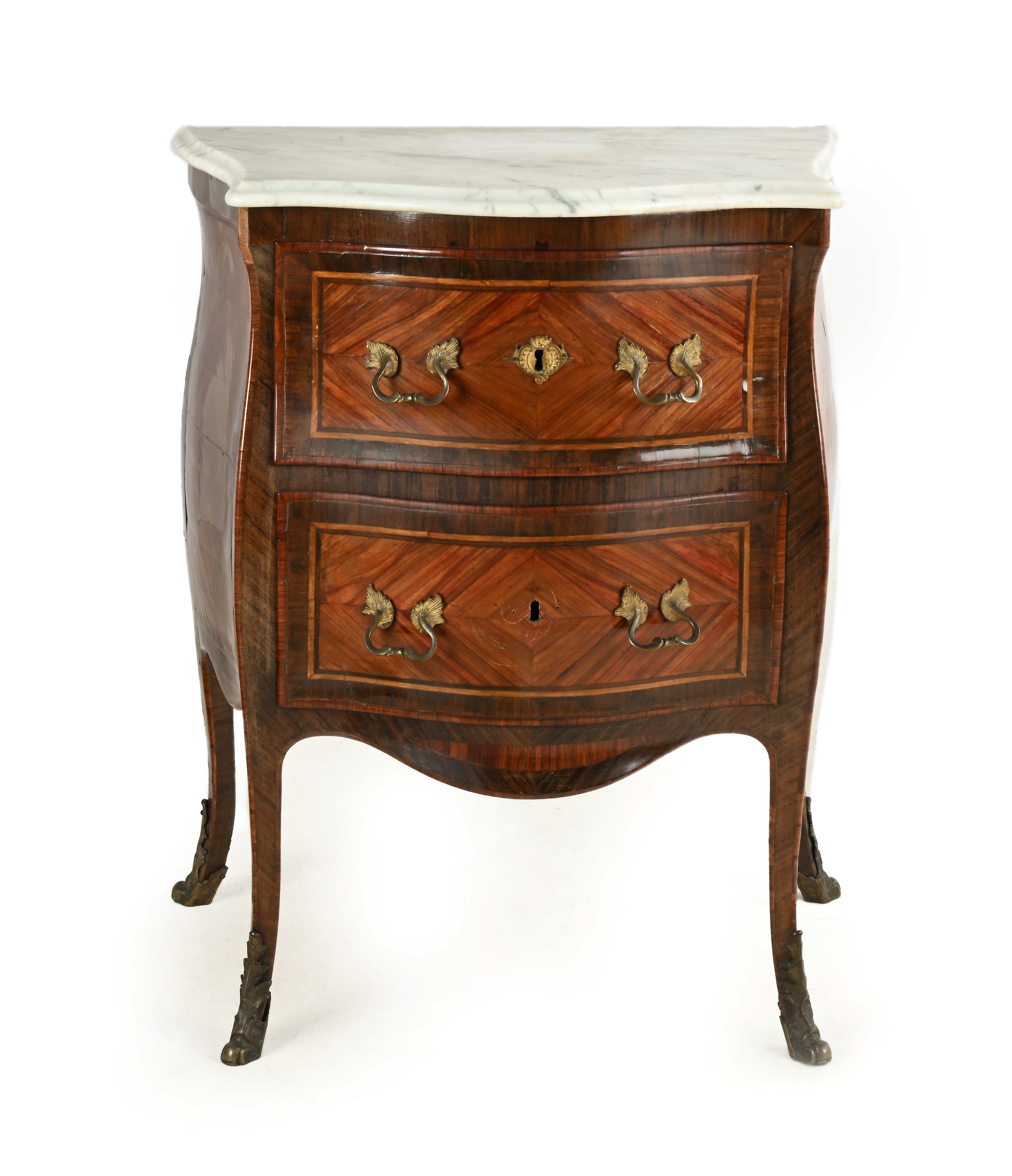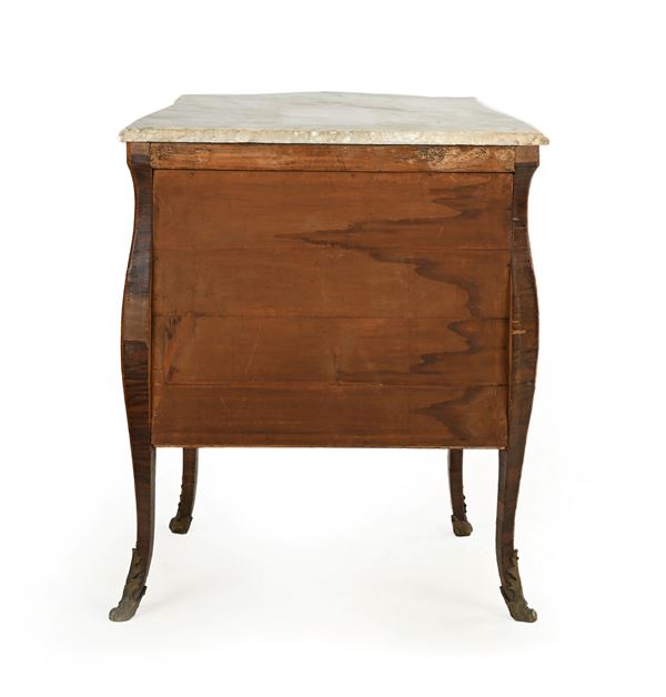 di forma sagomata con piano in marmo bianco, reca facciata suddivisa in due cassetti con bocchette e maniglie in bronzo dorato; spigoli curvilinei, gambe sfuggenti calzate di scarpette